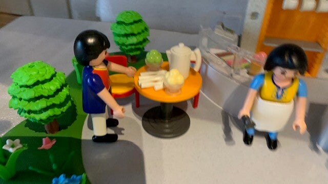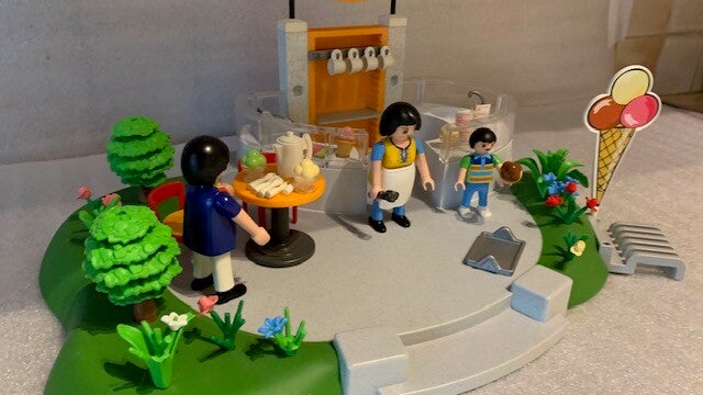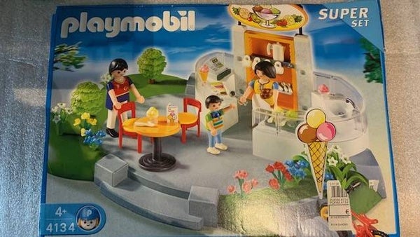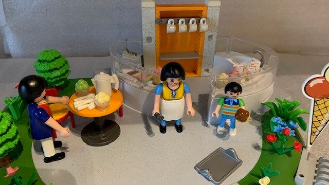 Deze set bestaat uit 3 speelfiguren, 4 tassen, 4 lepeltjes, een kan, ijsjes, een dienblad een ijsschep en een kassa.