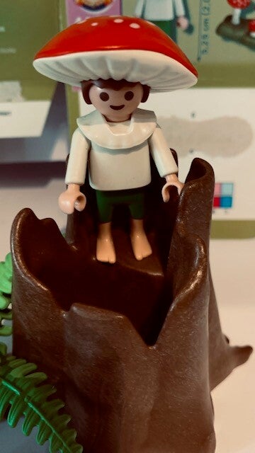 Het paddenstoelenelfje kijkt vanuit haar boomstam hoe de egeltjes rondscharrelen in het sprookjesbos.