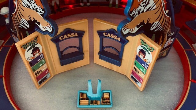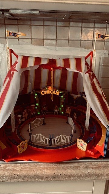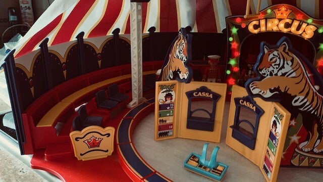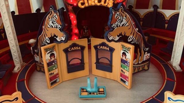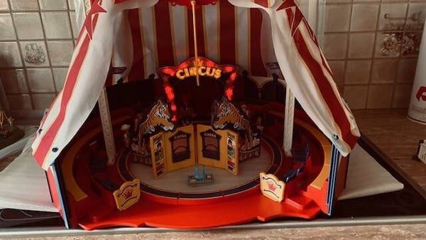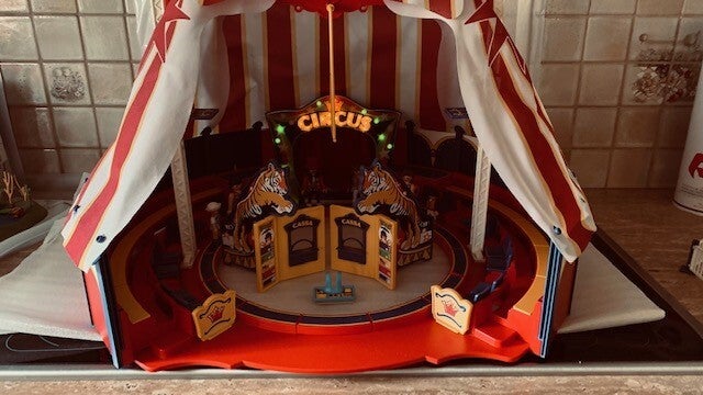 Inclusief 7 speelfiguren, waaronder een circusdirecteur, snackverkoper, 2 acrobaten en 3 bezoekers.