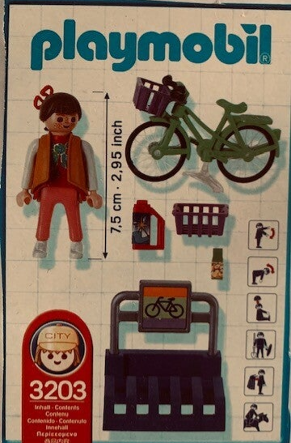 Deze set werd uitgebracht in 2002.De vrouw heeft net boodschappen gedaan in de supermarkt.Voor- en achterop haar fiets heeft ze handige mandjes.Inclusief fietsenrek.