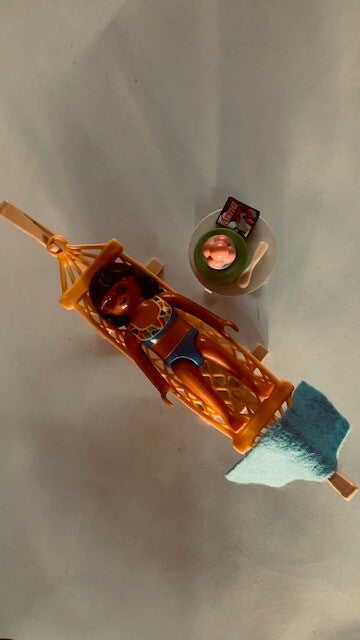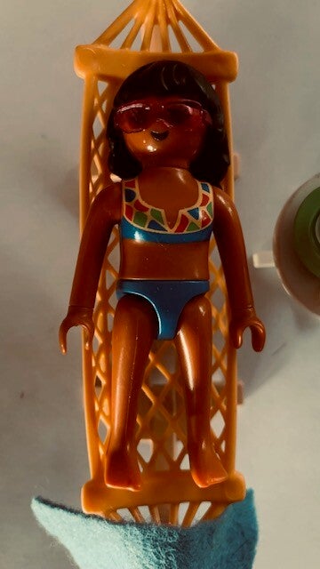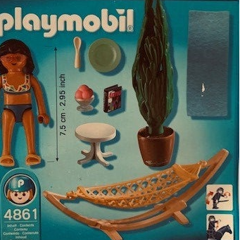 Deze set werd uitgebracht in 2009.Deze toeriste geniet heerlijk van de zon in haar haar hangmat. Gelukkig heeft ze nog een beetje schaduw van de boom.Voorzien van leuke accessoires zoals tafeltje, ijscoupe en een stranddoek.met instructieboekje