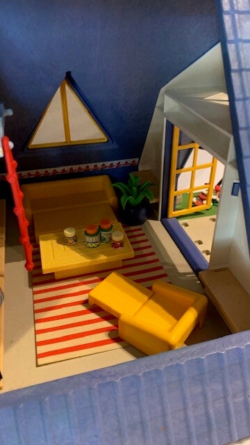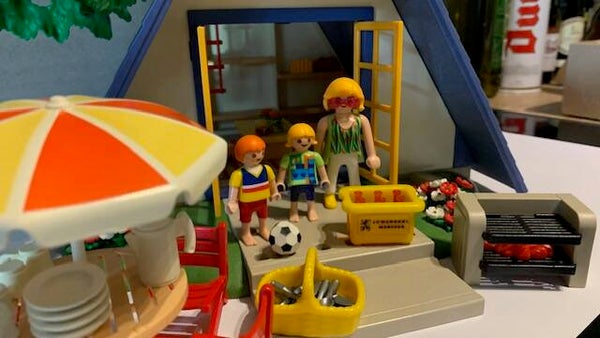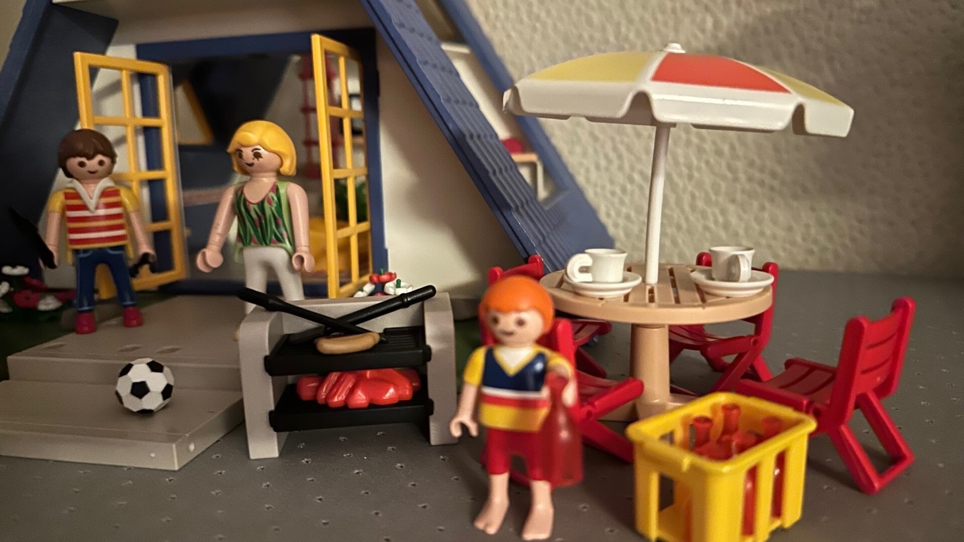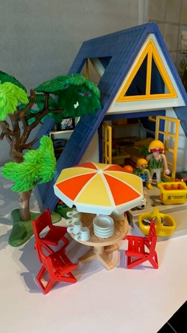 Deze set van Playmobil bevat o.a. het vakantiehuis, 4 Playmobil speelfiguren, een vloerkleed, een bank, een stoel, een salontafel, een tv, een tafel met parasol, planten, een barbecue en nog veel meer leuke accessoires.