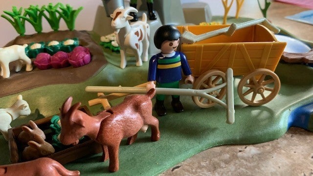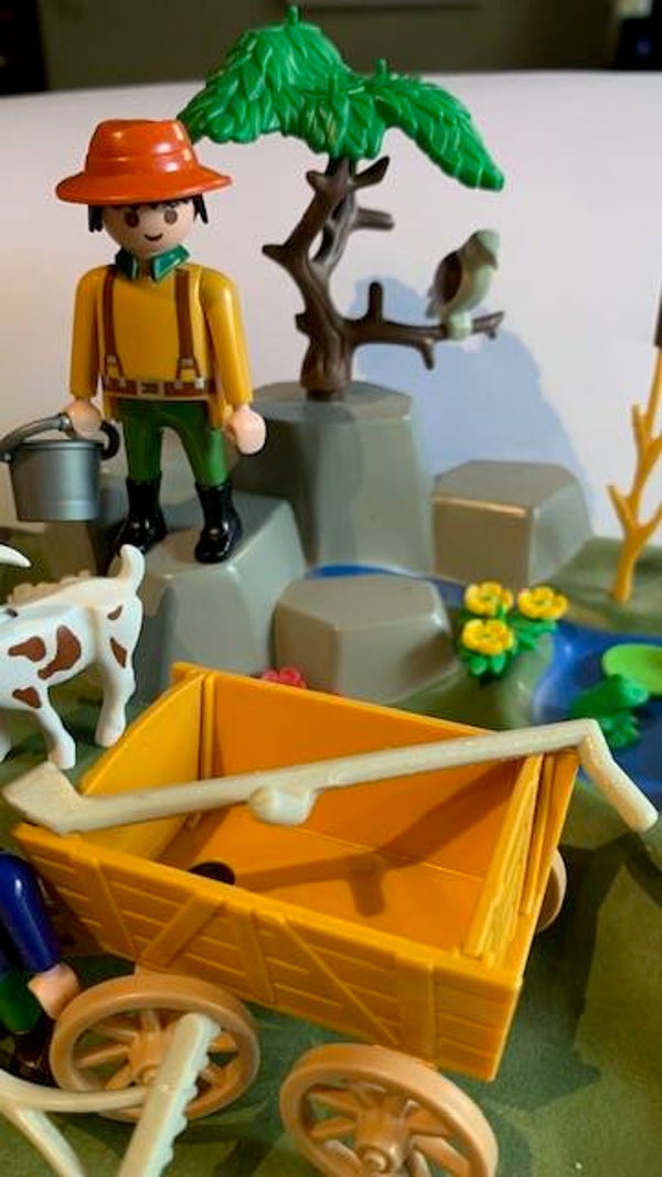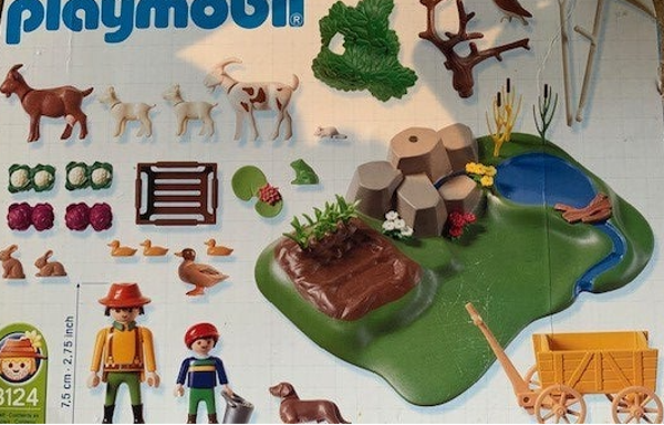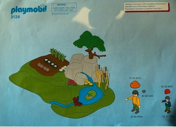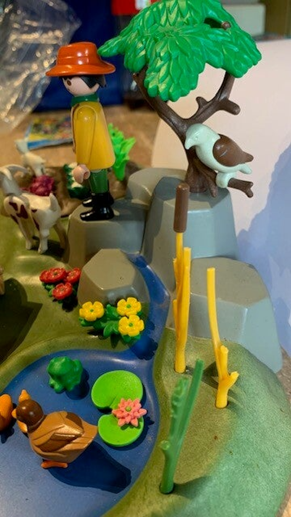 Leuke uitbreidingsset voor boerderij met vijver, riviertje met bruggetje, boompje, moestuin, vogel, eenden, hond en geitjes. Inclusief handkar en 2 Playmobil speelfiguren.
