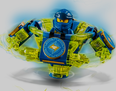 Zet de LEGO® NINJAGO® Jay minifiguur in zijn Spinjitzu bliksemtornado spinner, kies voor de aanvals-, verdedigings- of snelheidsstand en spin erop los.