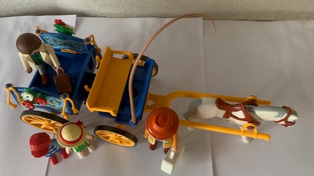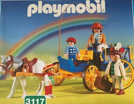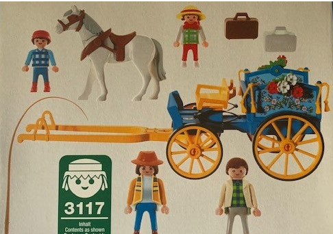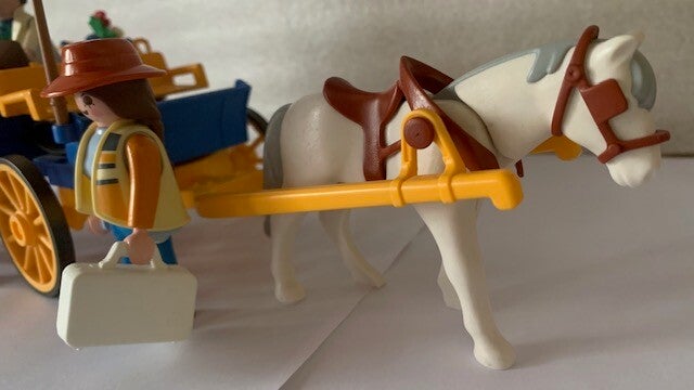 Inclusief 4 Playmobil speelfiguren, een paard en 2 koffers.
