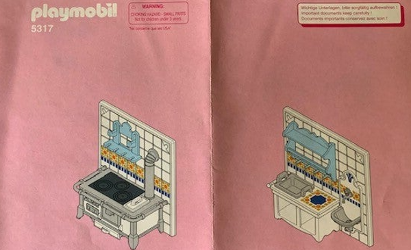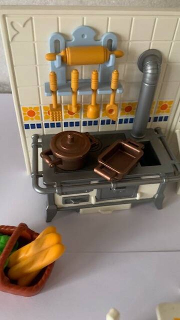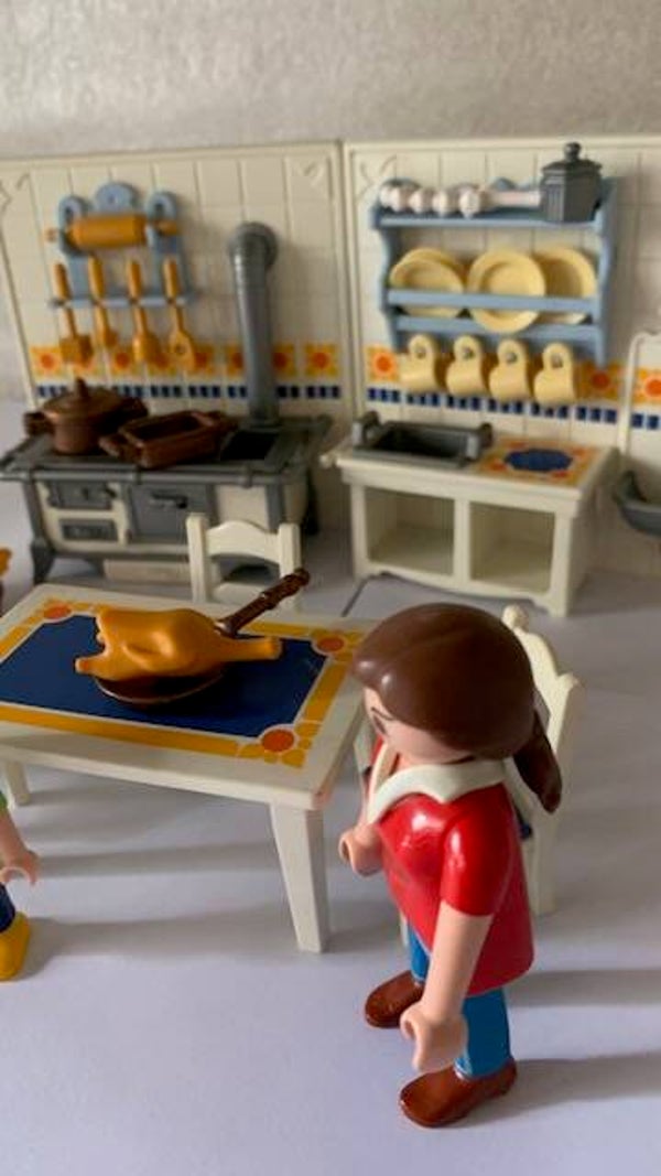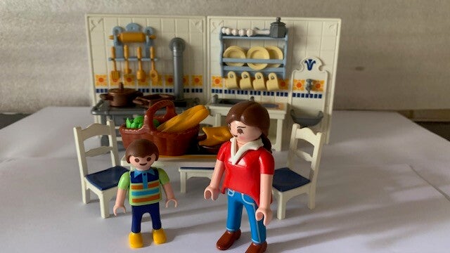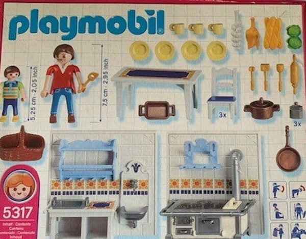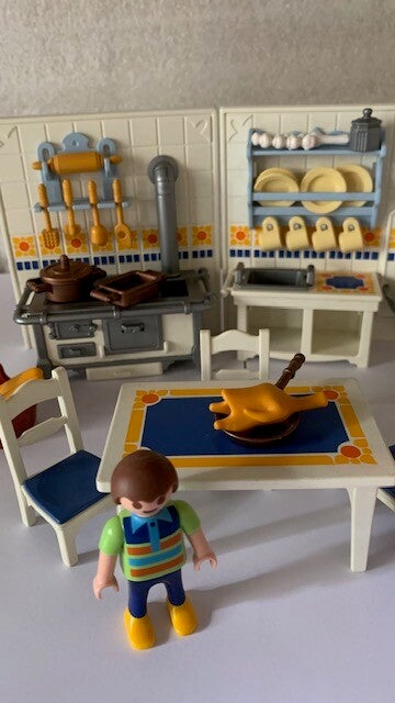 Deze antieke keuken inrichting bestaat uit een retro gasfornuis met 3 kookpitten en een oven, een gootsteen, eettafel met 3 stoelen, keukengerei, borden, mokken, pannen en een mand met boodschappen. Inclusief 2 Playmobil speelfiguren.