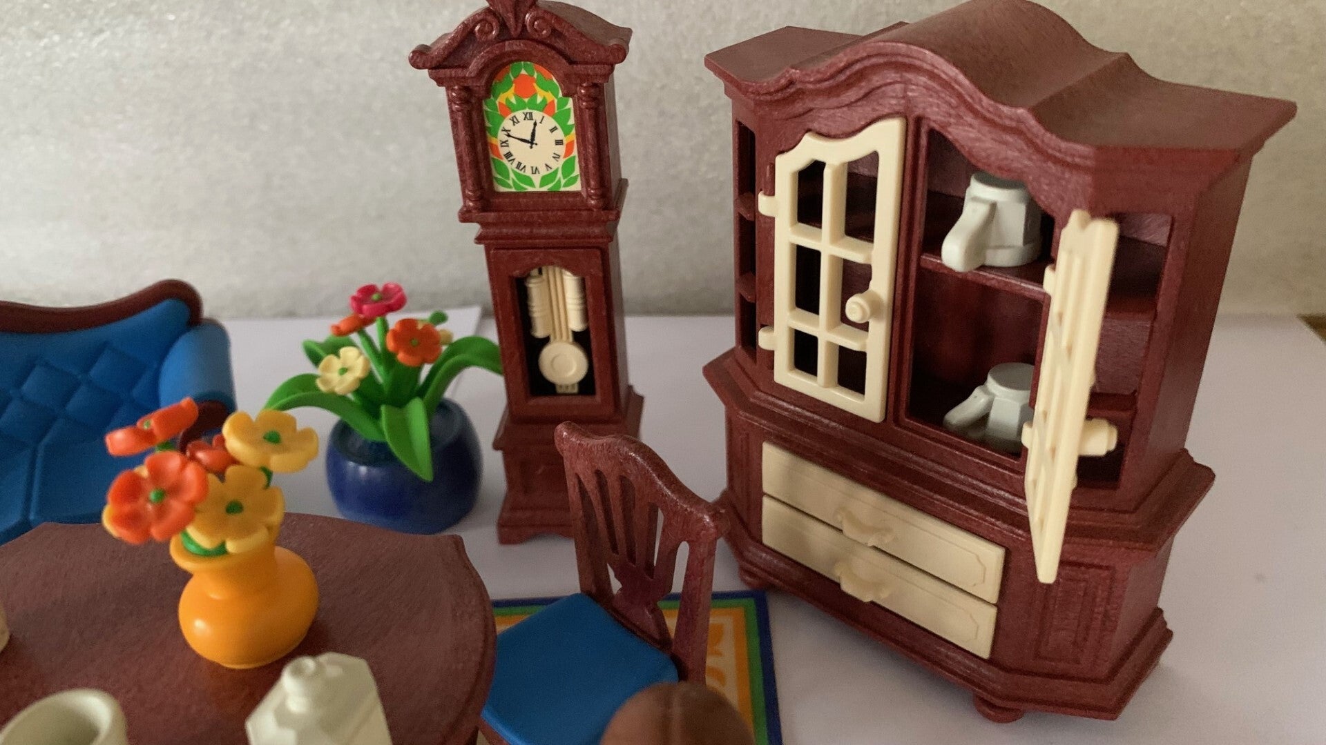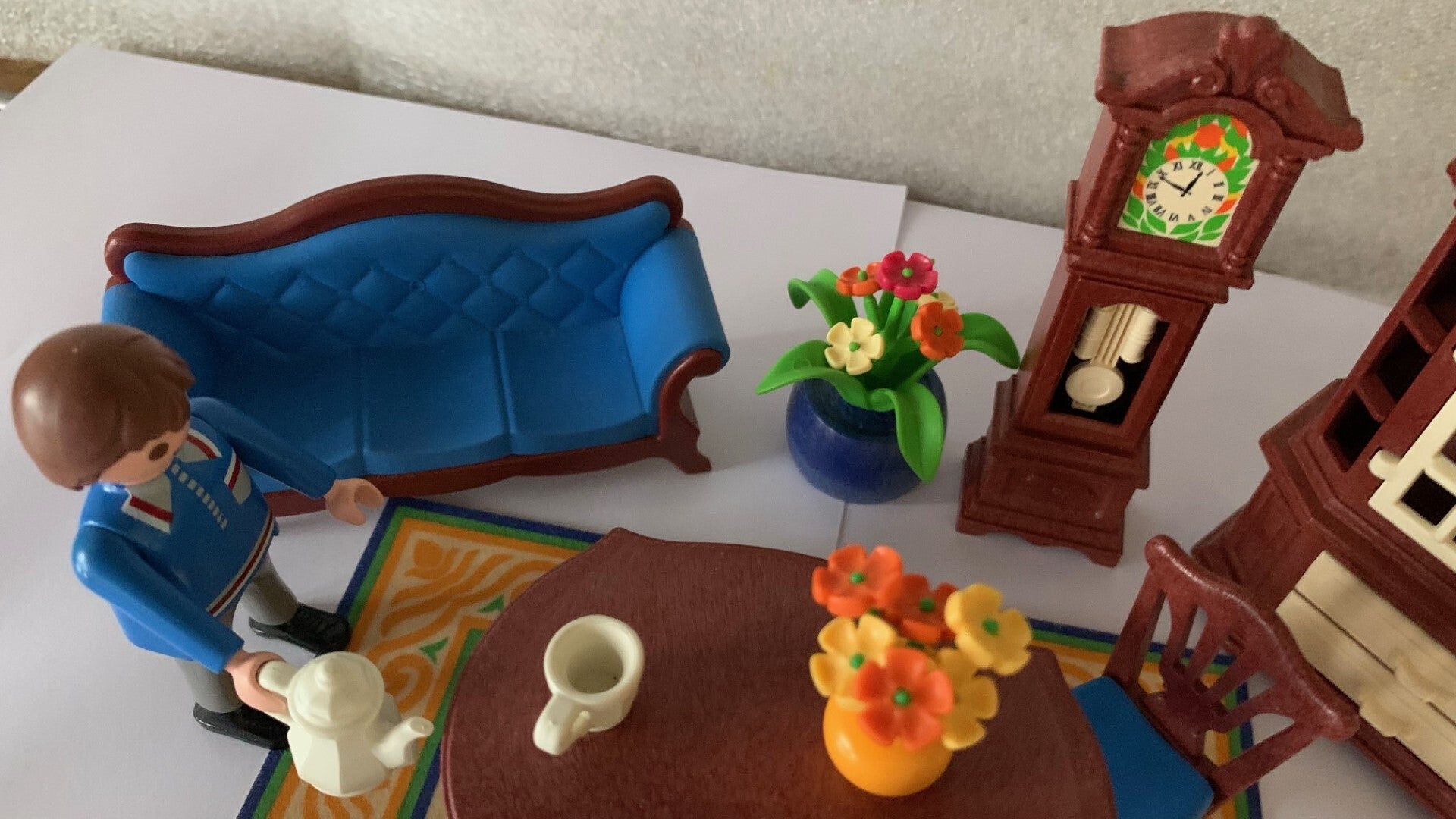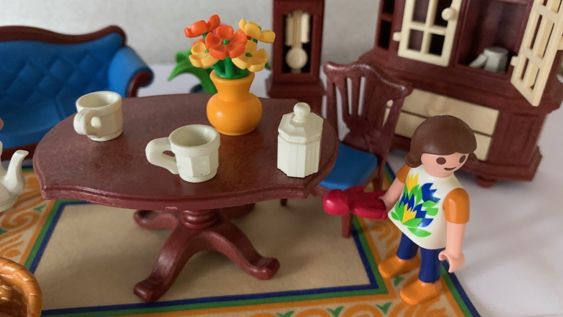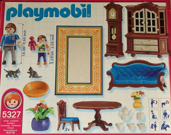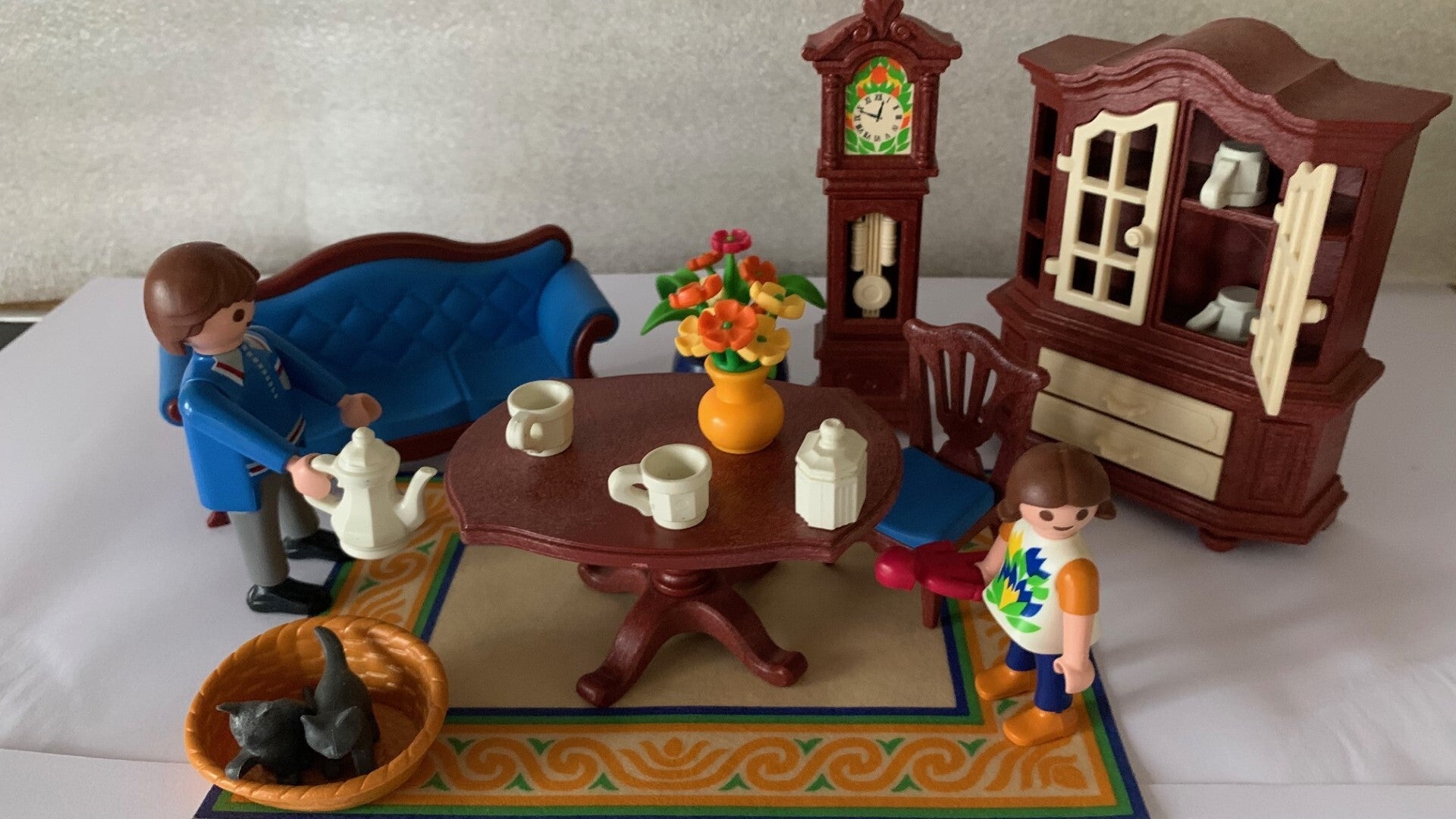 Deze antieke woonkamer inrichting bestaat uit 2 nostalgische stoelen, zitbank, tafel, staande klok, servieskast, plant en vloerkleed. Kastdeuren en schuifladen kunnen geopend worden. Inclusief 2 Playmobil speelfiguren en mand met poesjes.