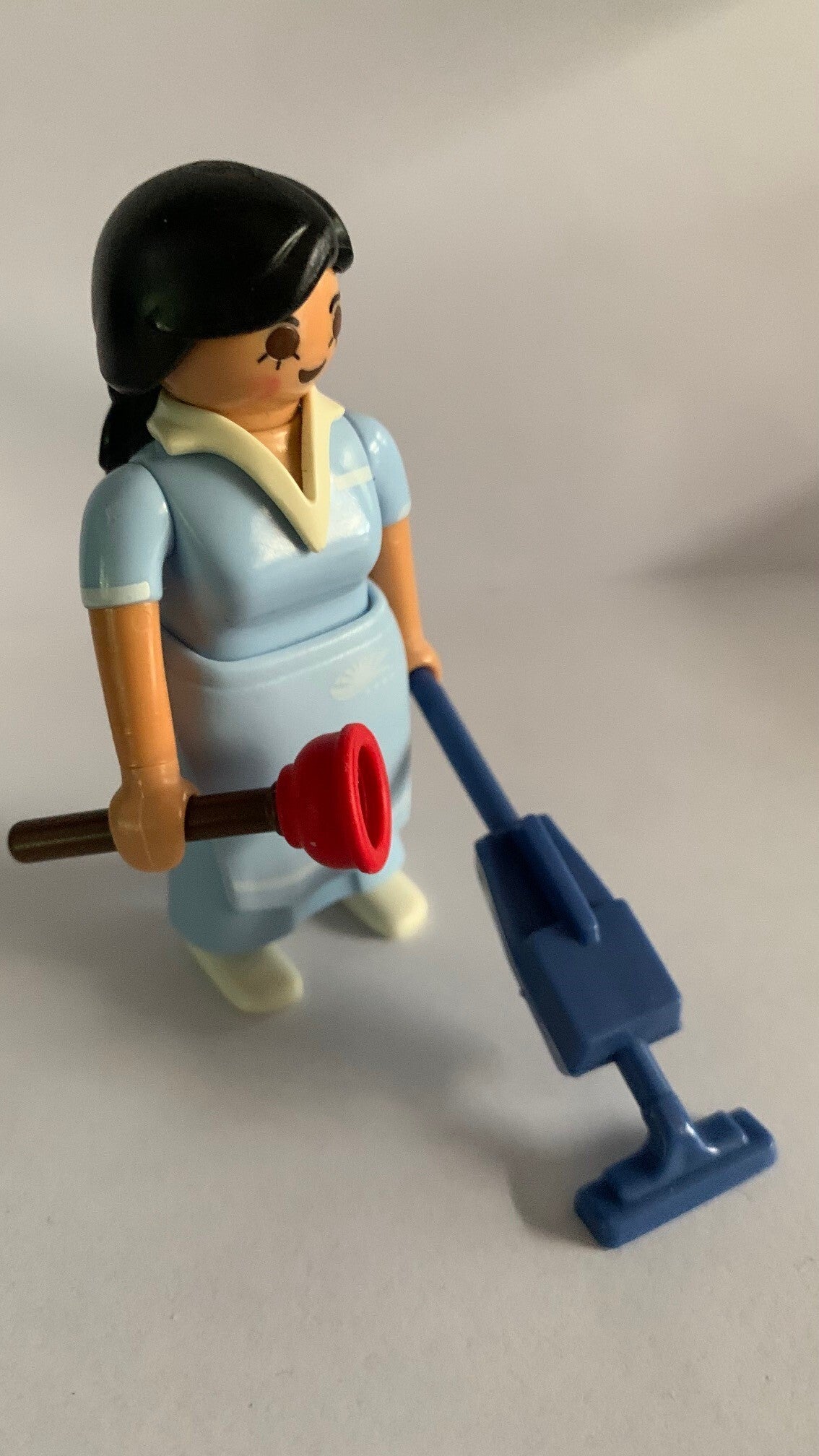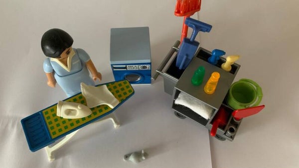 Alles staat op het schoonmaakspullen staan op wagentje. Help jij het Playmobil kamermeisje alle kamers weer schoon te maken?