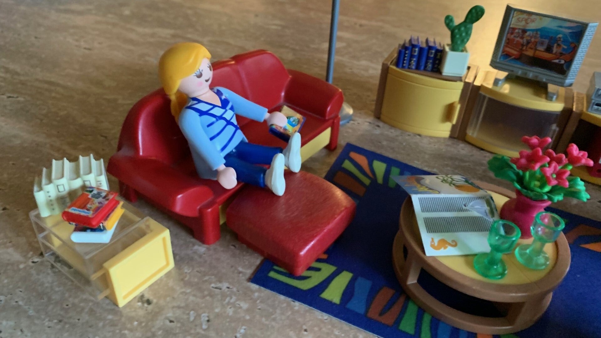 De grote woonkamer set bevat een aquarium, verschillende kastjes, tv, audiosysteem, een tapijt, staande lamp, salontafel en een slaapbank welke je om kunt bouwen tot een bed.