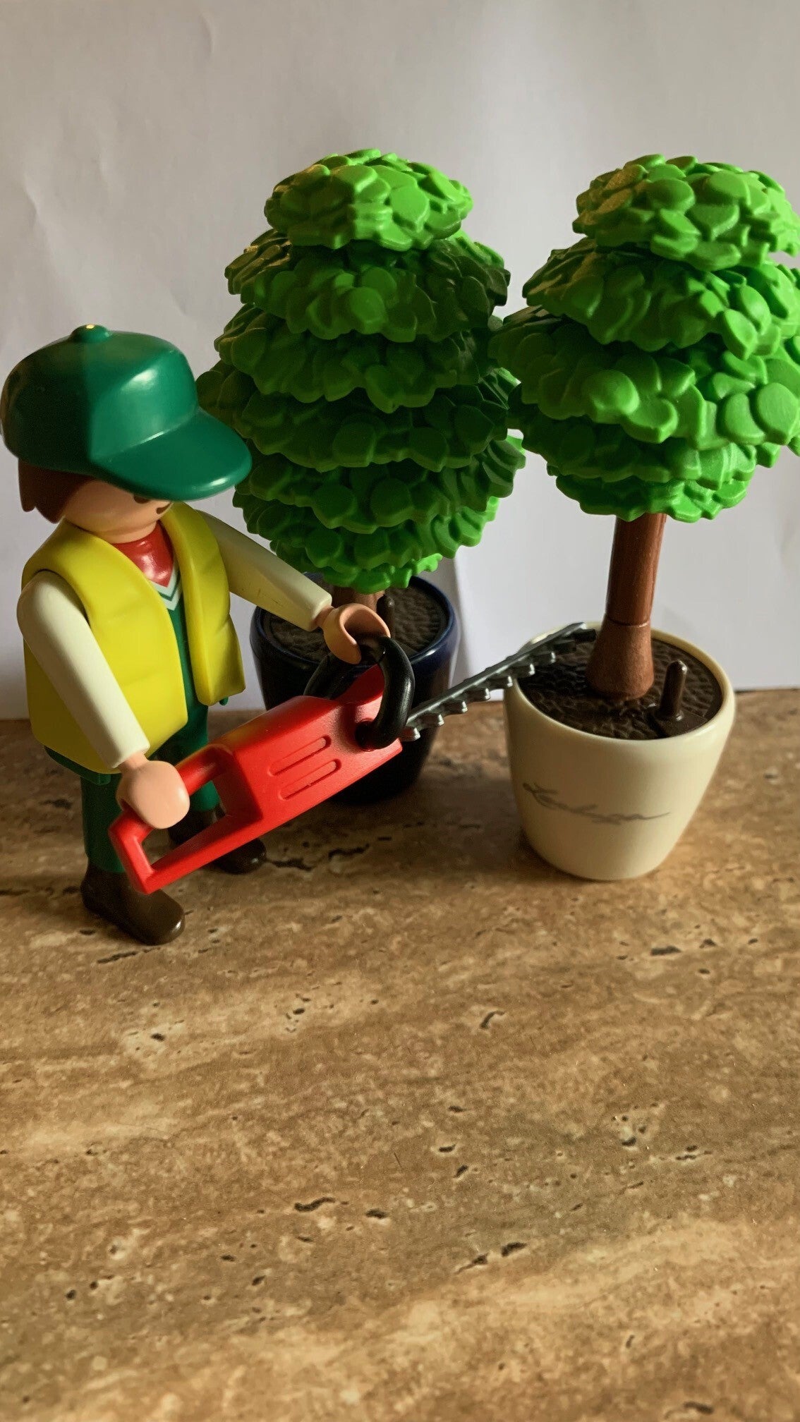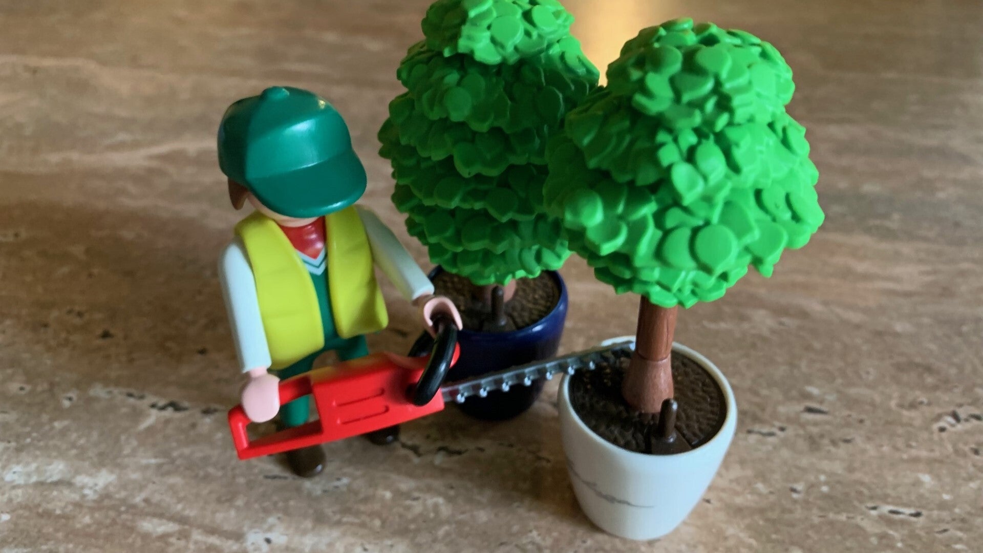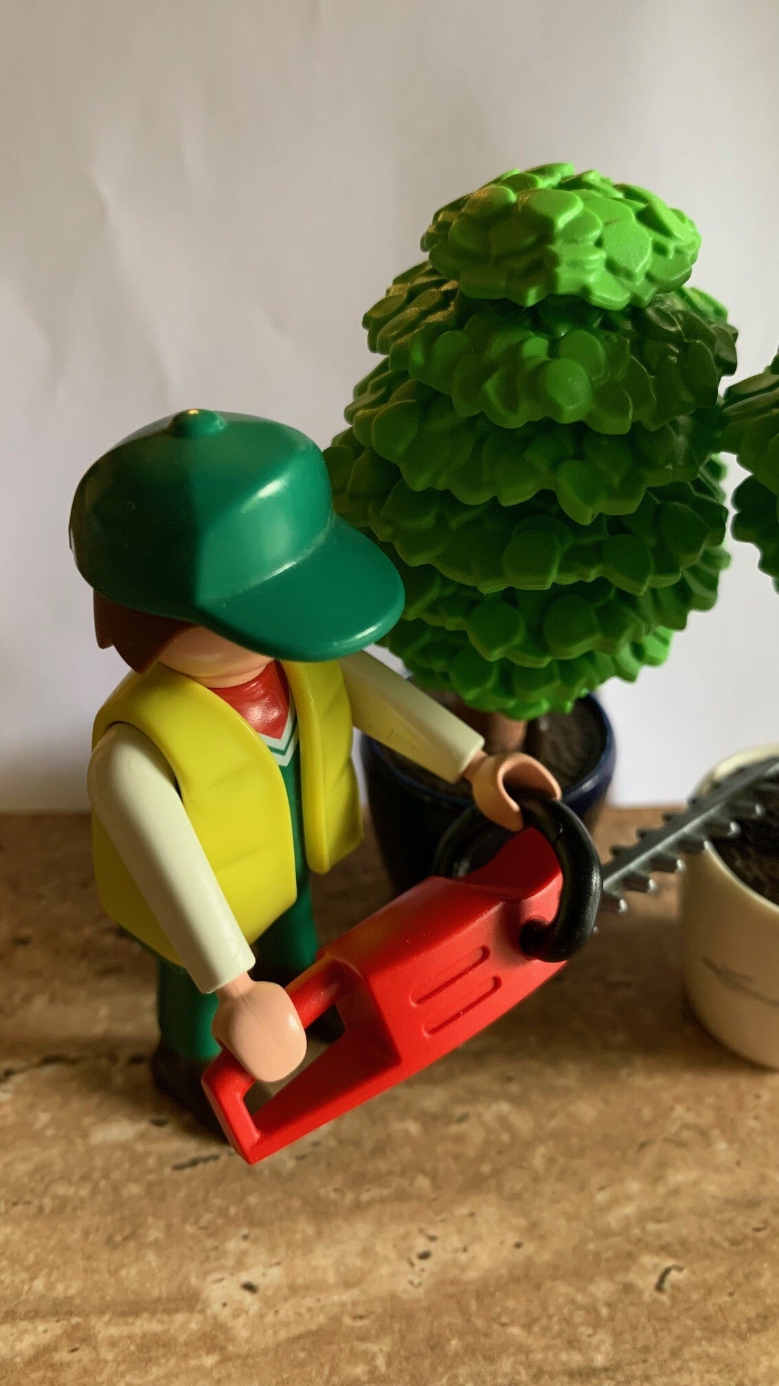 Deze tuinman snoeit de bomen met zijn heggenschaar, zodat ze weer mooi van vorm zijn.