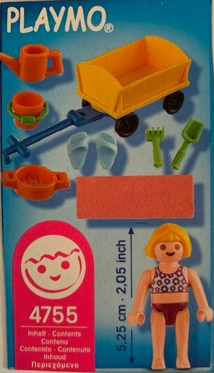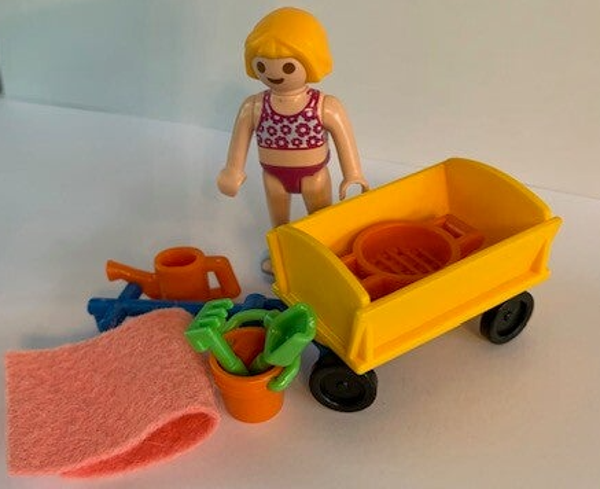 Het is een mooie warme zomerdag. Het meisje maakt gebruik van de handige Playmobil bolderwagen om een dagje naar de kust te gaan. Het meisje loopt op slippers en heeft leuk speelgoed bij zich om op het strand met zand te spelen.