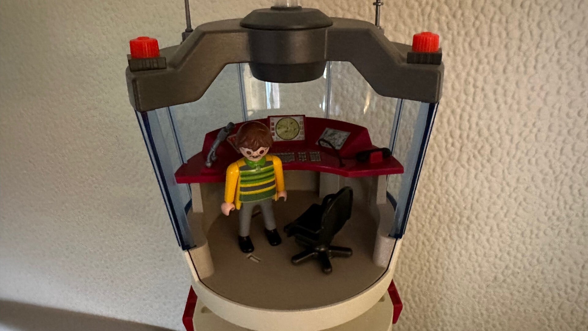 De verkeerstoren bevat een bedieningspaneel en een echt werkend zwaailicht op het dak van de toren.