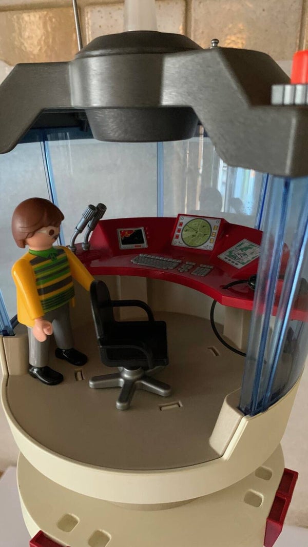 Met behulp van het bedieningspaneel en de geavanceerde radarapparatuur bewaakt hij de veiligheid van alle startende en landende vliegtuigen. Zojuist heeft hij opstijg signaal aan het grote Playmobil verkeersvliegtuig (art. 4310) gegeven.