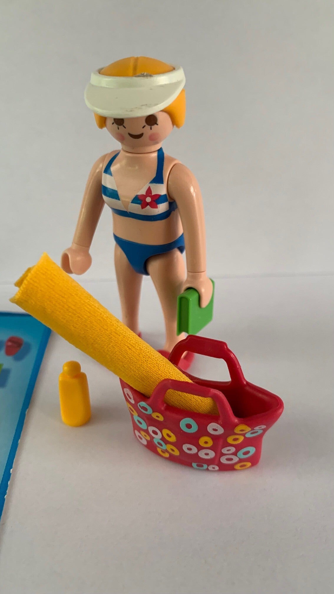 Deze toeriste is klaar voor een dagje aan het strand! Ze gaat lekker zonnebaden en heeft een boekje mee zodat ze zich niet hoeft te vervelen. Inclusief badlaken, draagtas, slippers en zonnebrandcrème.