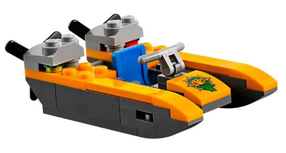 - De boot die wordt meegeleverd heeft ruimte voor de drie minifiguren en de onderzoeksuitrusting.