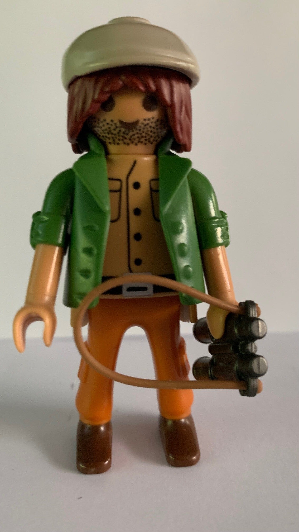 Deze playmobilman met pet en verrekijker staat op het punt de natuur in te trekken.