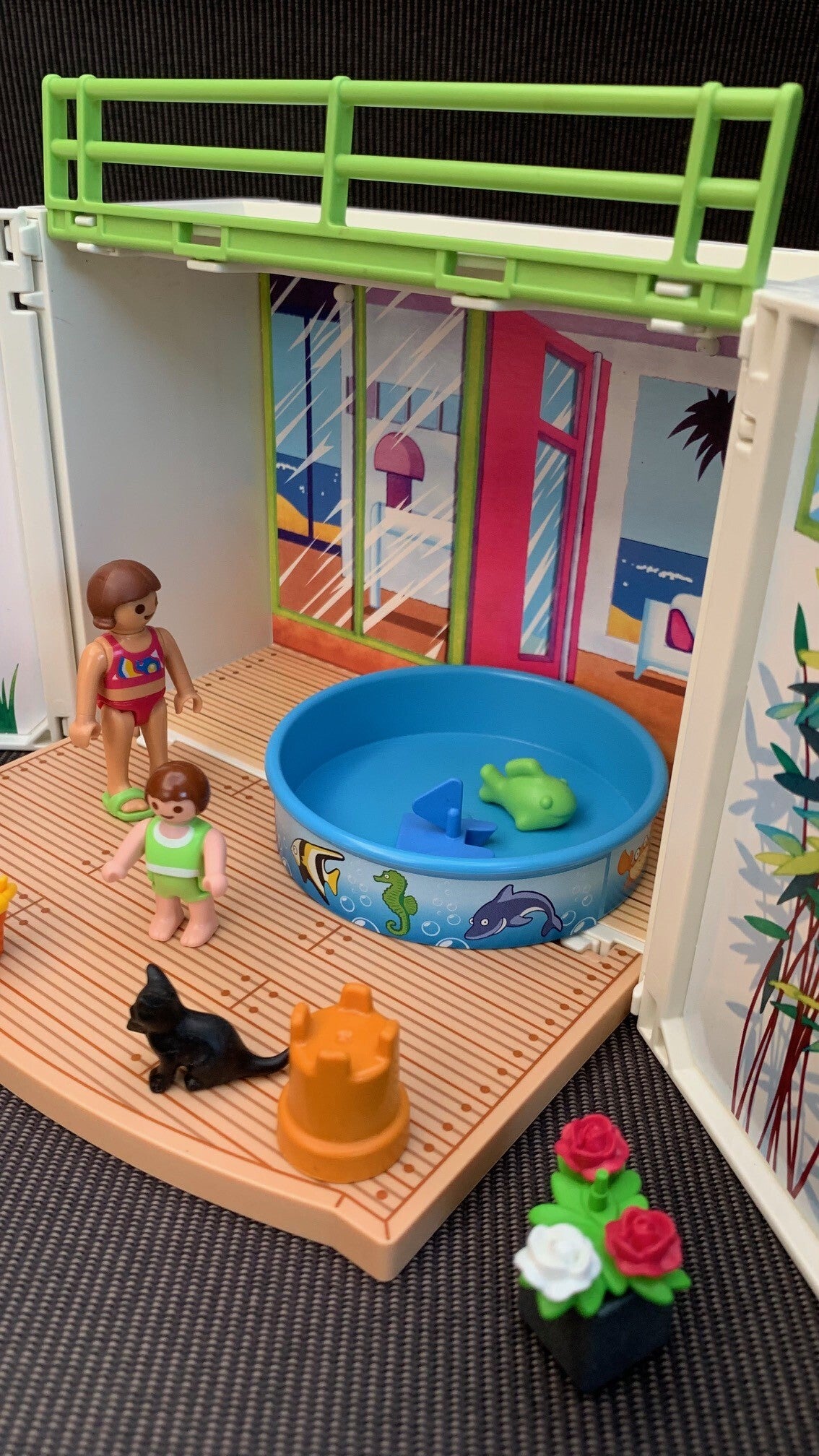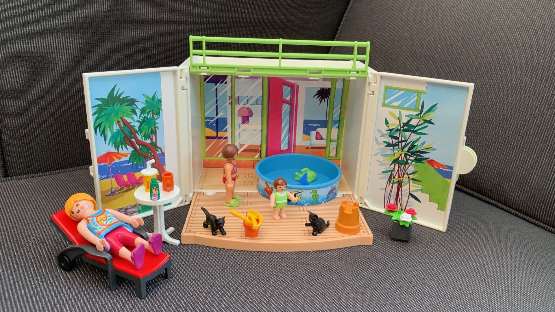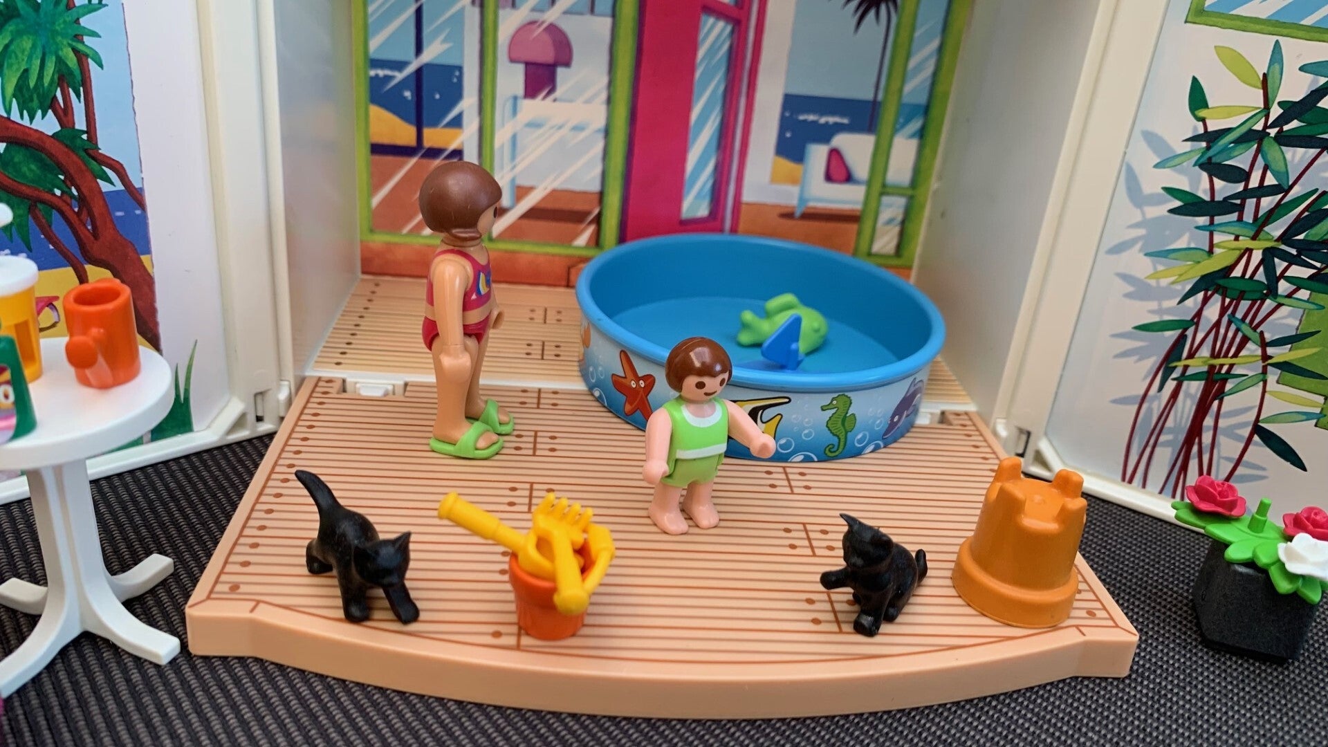 Een plonsbadje voor de kinderen en een grote portie aardbeienijs voor mama zorgen voor de nodige pret en verkoeling. Inclusief ligstoel, poesjes, veel speelgoed en 3 Playmobil speelfiguren.