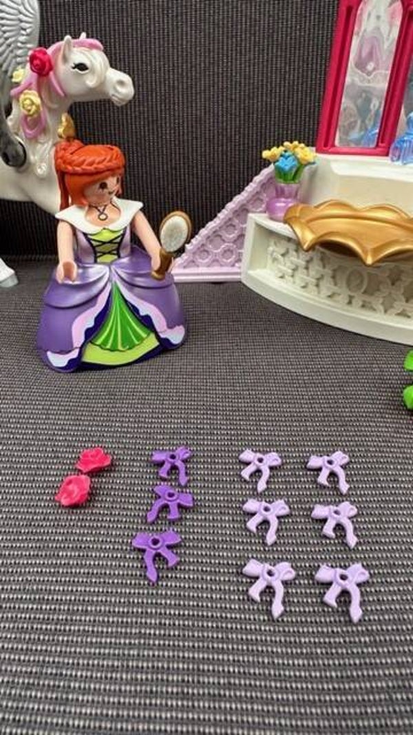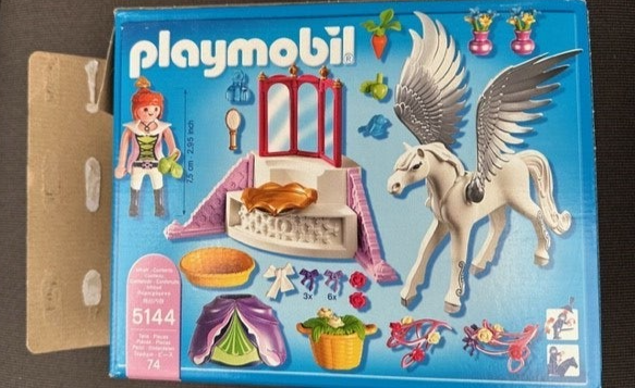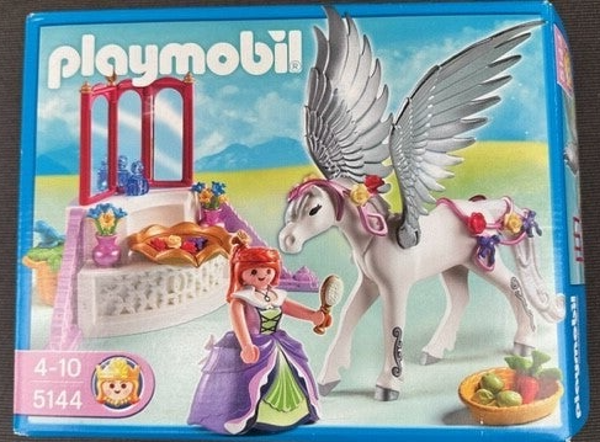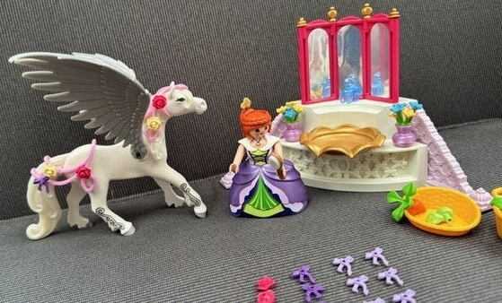 Deze prinses is haar mooie Pegasus-paard aan het versieren met bloemen en strikken.