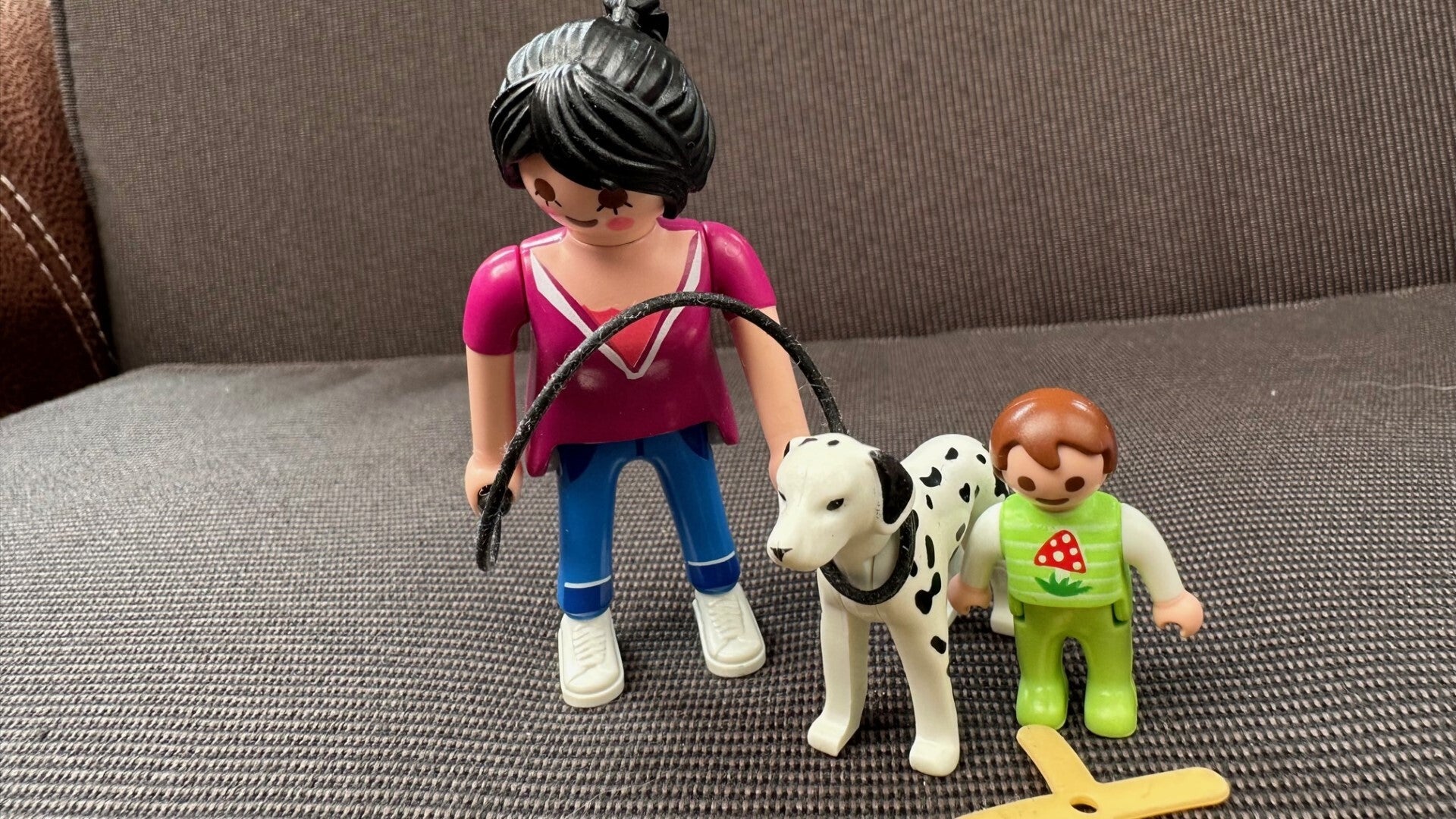 De set bevat een mama, een baby, een draagzak en een dalmatiër met leiband.