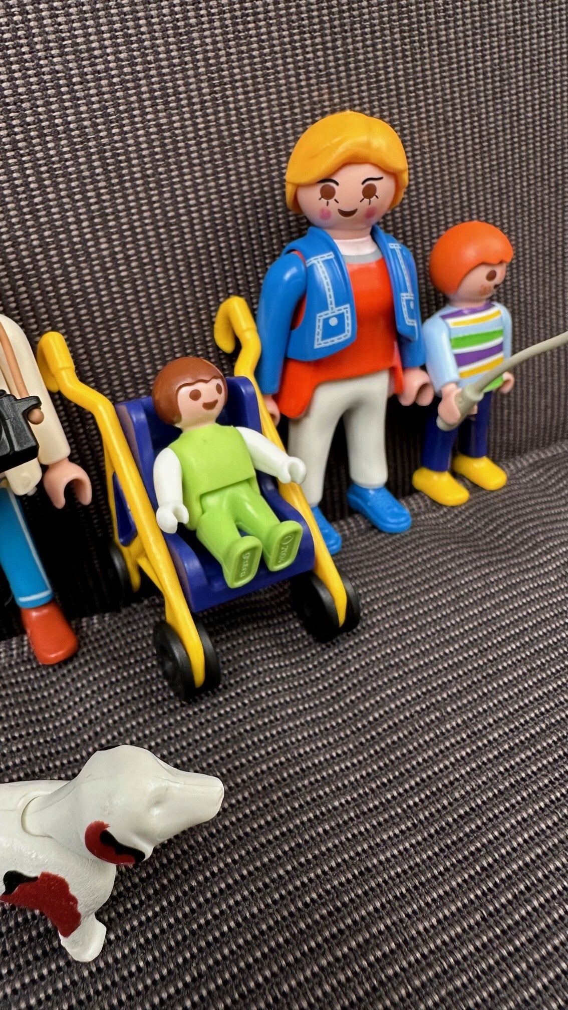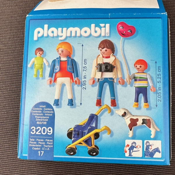 Deze moeder gaat samen met haar man, zoontje en baby wandelen. Zij nemen de hond, een buggy, fotocamera en ballon mee.