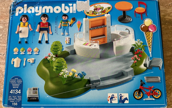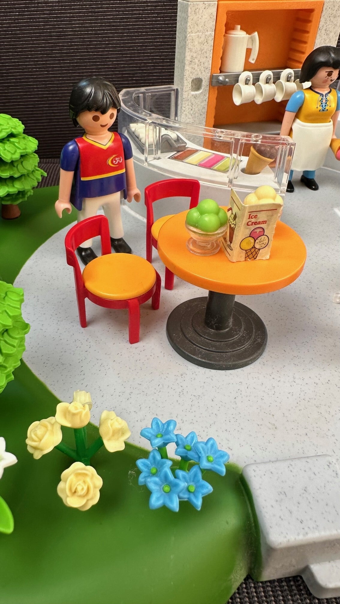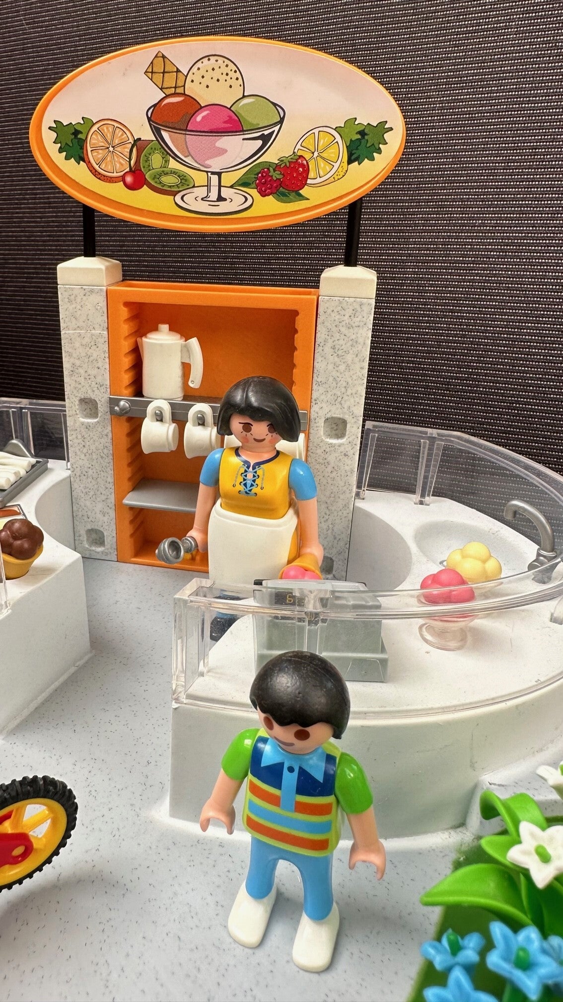 Deze set bestaat uit 3 speelfiguren, 4 tassen, 4 lepeltjes, een kan, ijsjes, een dienblad een ijsschep en een kassa.