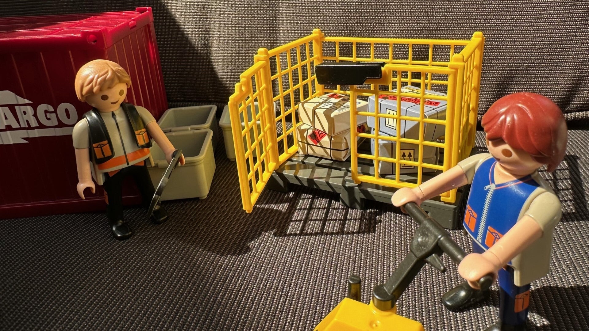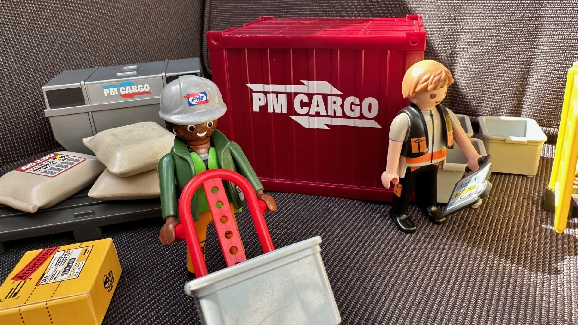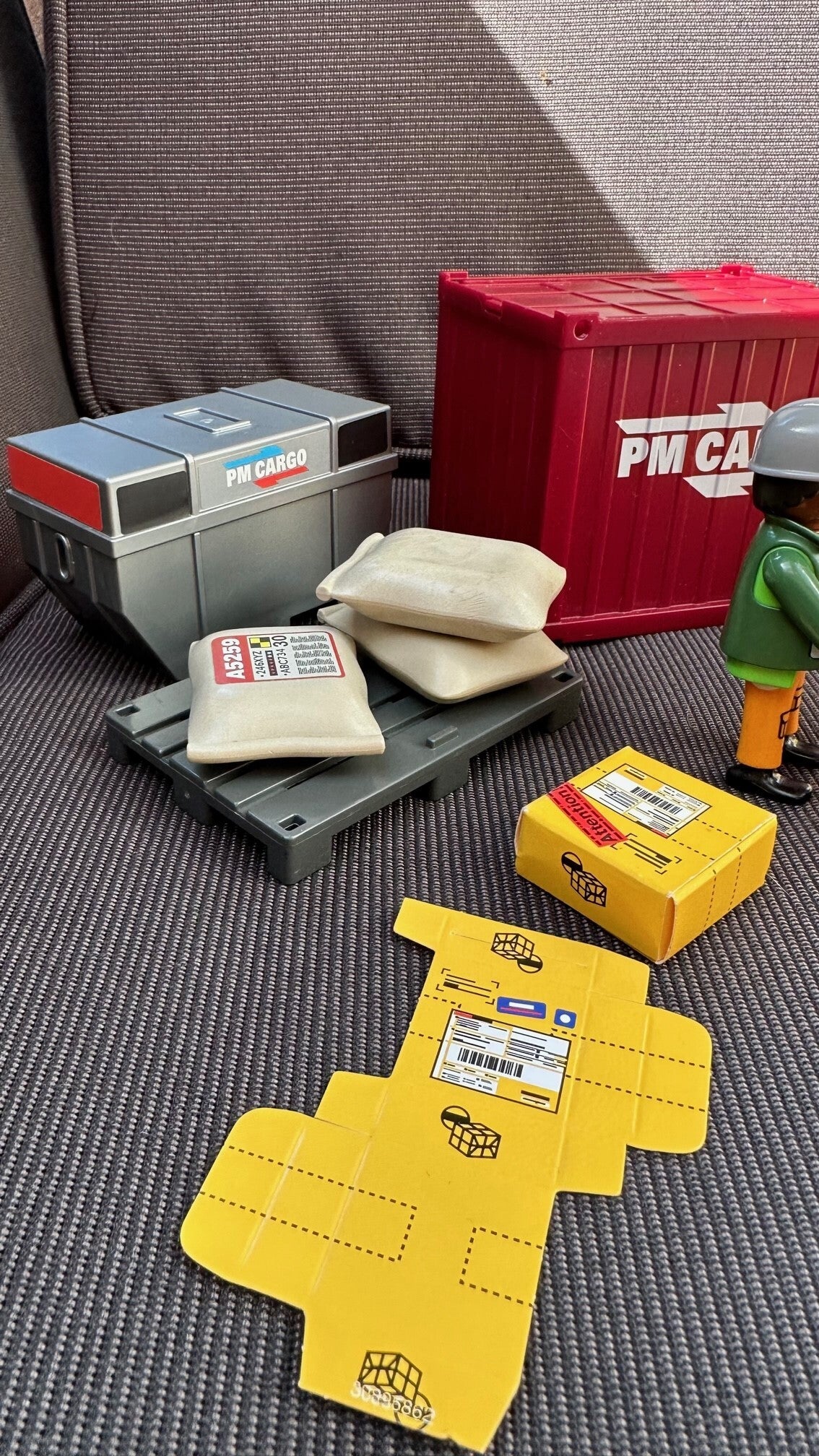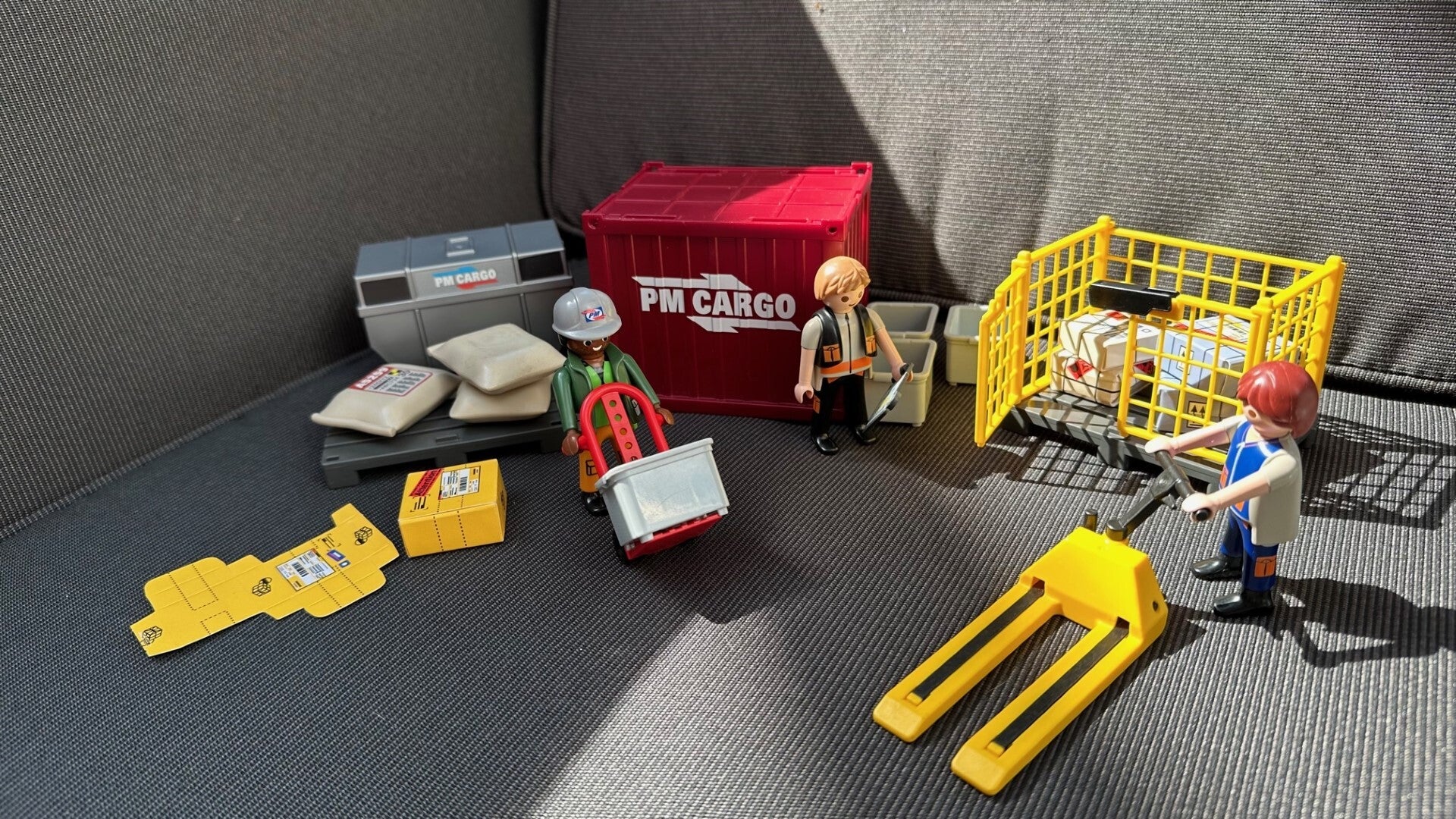 De set bevat 3 Playmobil speelfiguren, een palletwagen, een steekwagen, pallet met afsluitbare kooi, containers en diverse zakken, pakketten en bakken.