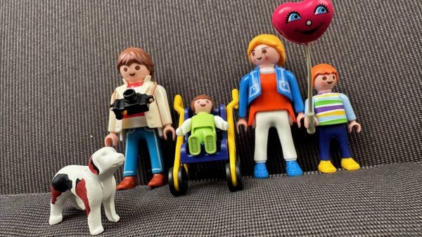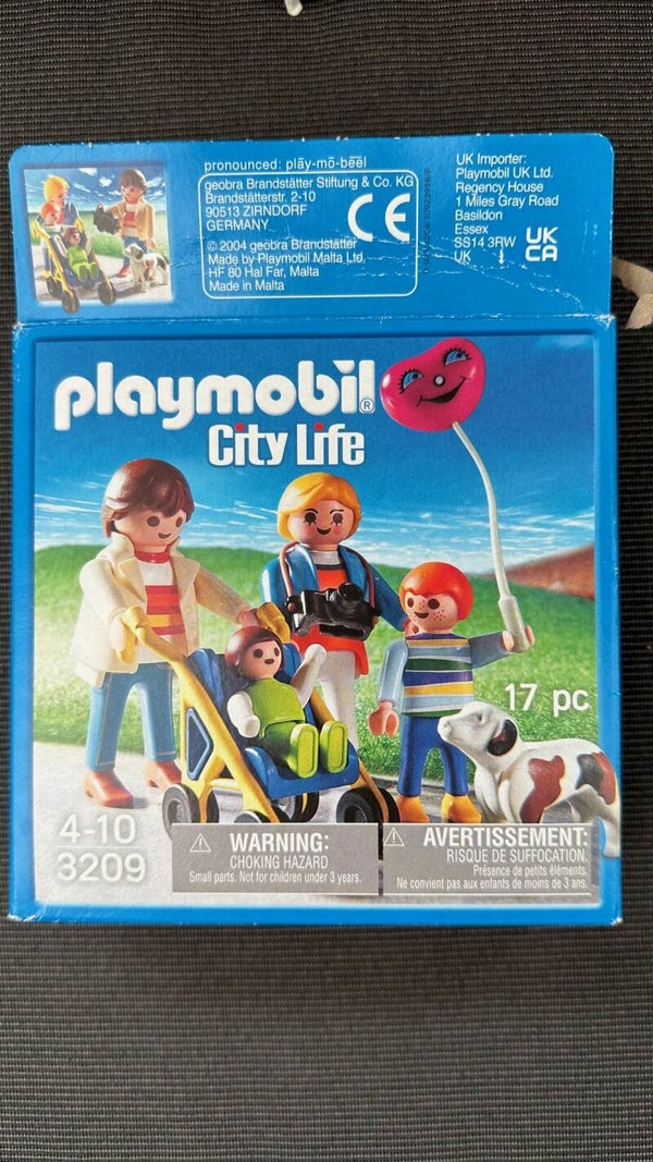 Deze Playmobil moeder gaat samen met haar man, zoontje en baby wandelen. Zij nemen de hond, een buggy, fotocamera en ballon mee.