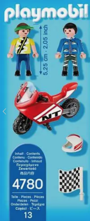 Deze junior racer van Playmobil pakt zijn motor en scheurt als eerste over de finish! Inclusief 2 Playmobil figuurtjes en geblokte vlag.