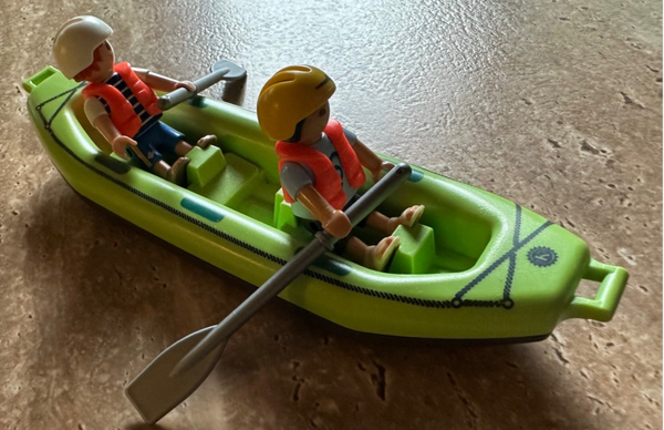 Deze 2 kinderen maken zich klaar voor een namiddag raften! Ze zetten hun helmen op, doen hun reddingsvesten aan en leggen de peddels in de raftingboot! Klaar? Gaan! Met een flinke snelheid glijden ze over de golven van de rivier… Diegene die het meest nat wordt wint!