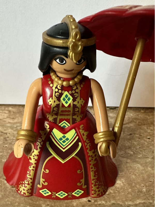 Met haar bijpassende paraplu is deze Indische Playmobil prinses een ware schoonheid! De donkere Dame is gekleed in een rode jurk met mooie gouden details. Het je haar prachtige haar-sierraad al gezien?