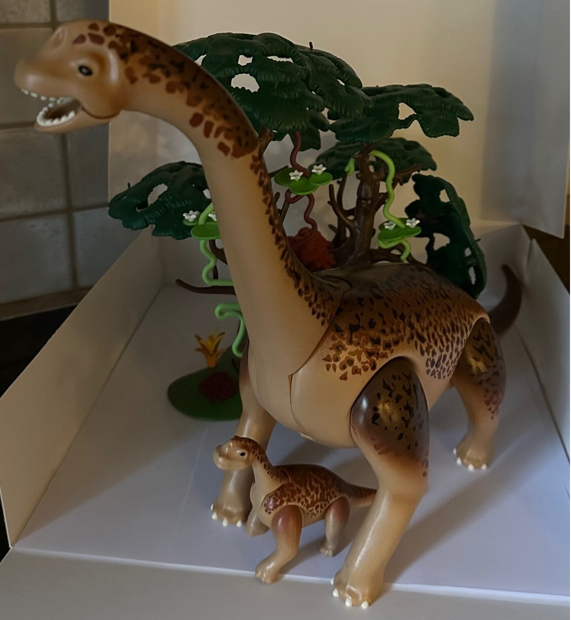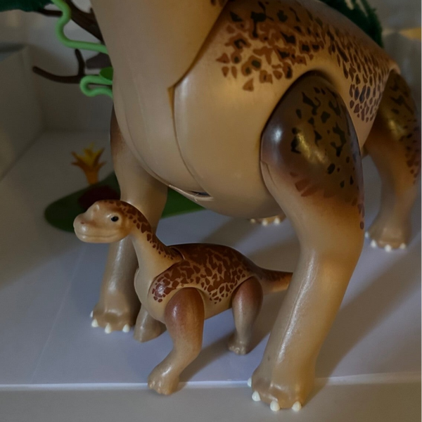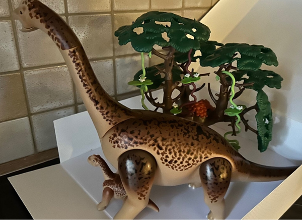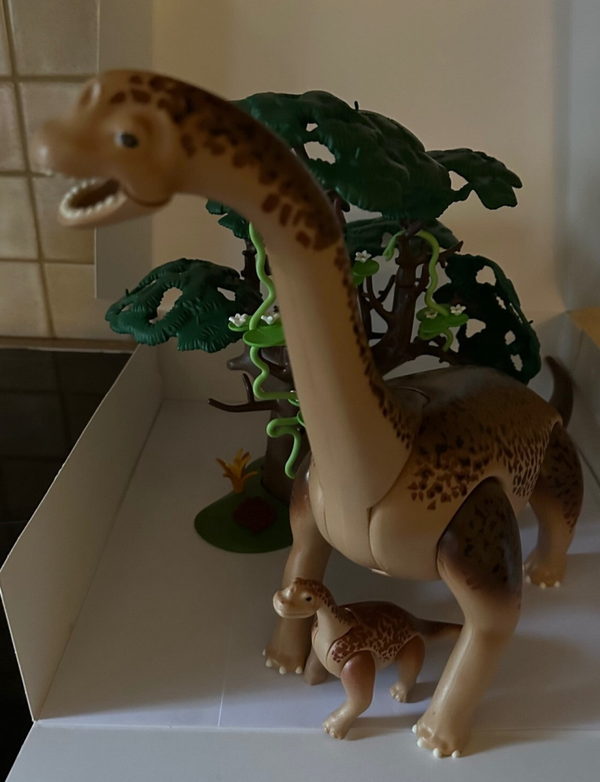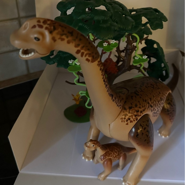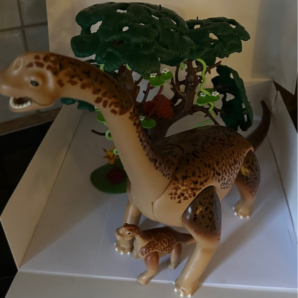 De Brachiosaurus is samen met haar jong op zoek naar voedsel. Ze hebben een hoge boom gevonden waar ze lekker van kunnen grazen.