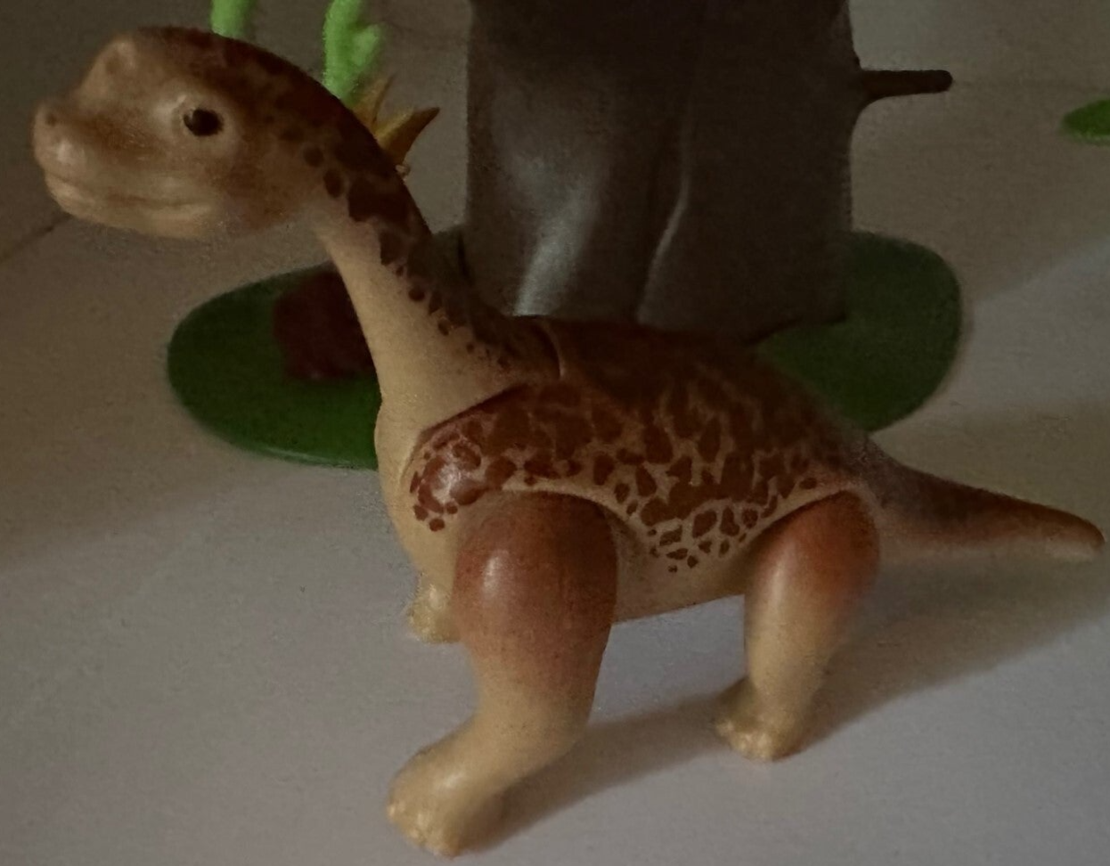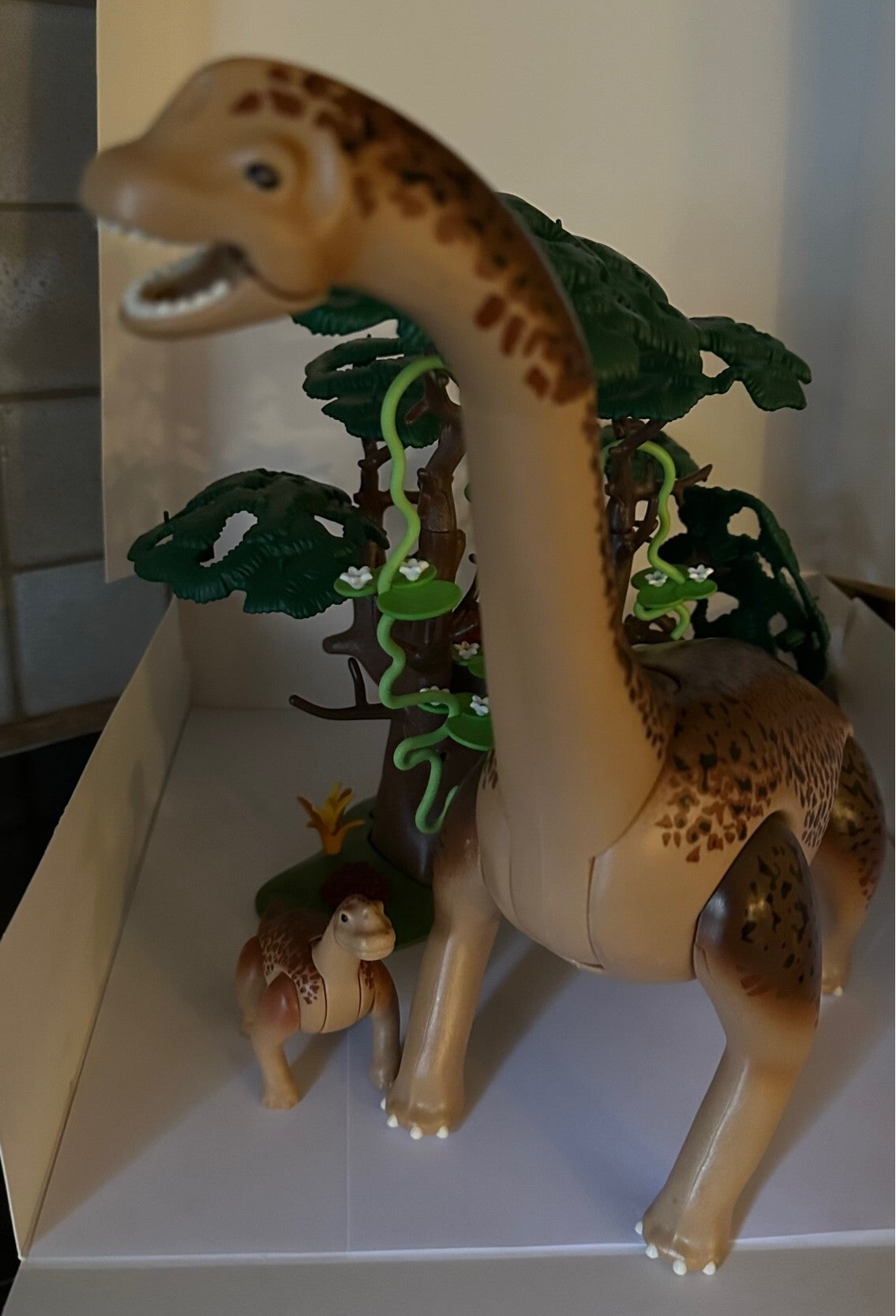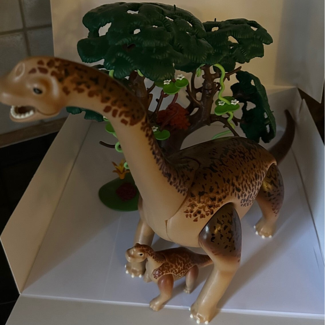 De Brachiosaurus is samen met haar jong op zoek naar voedsel. Ze hebben een hoge boom gevonden waar ze lekker van kunnen grazen.