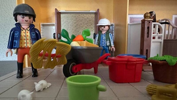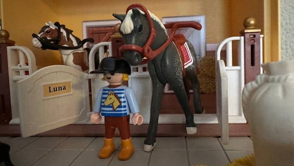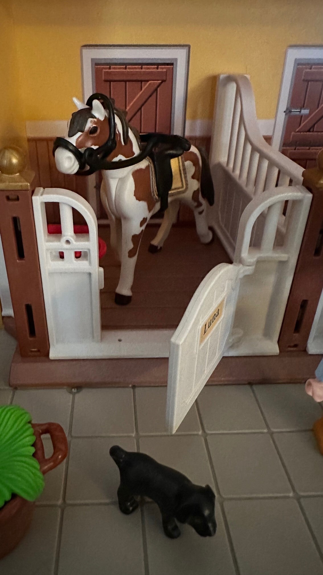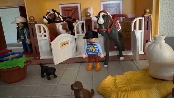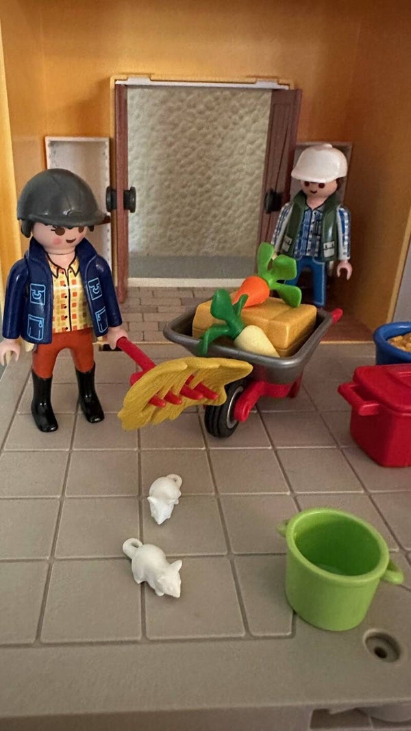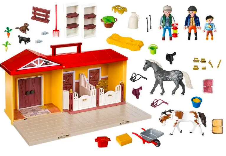 Er zit van alles bij deze stal om je paarden te verzorgen zoals hooi, wortels en diverse borstels. Inclusief 3 Playmobil speelfiguren, 2 paarden, puppy's muizen en een kruiwagen met riek.