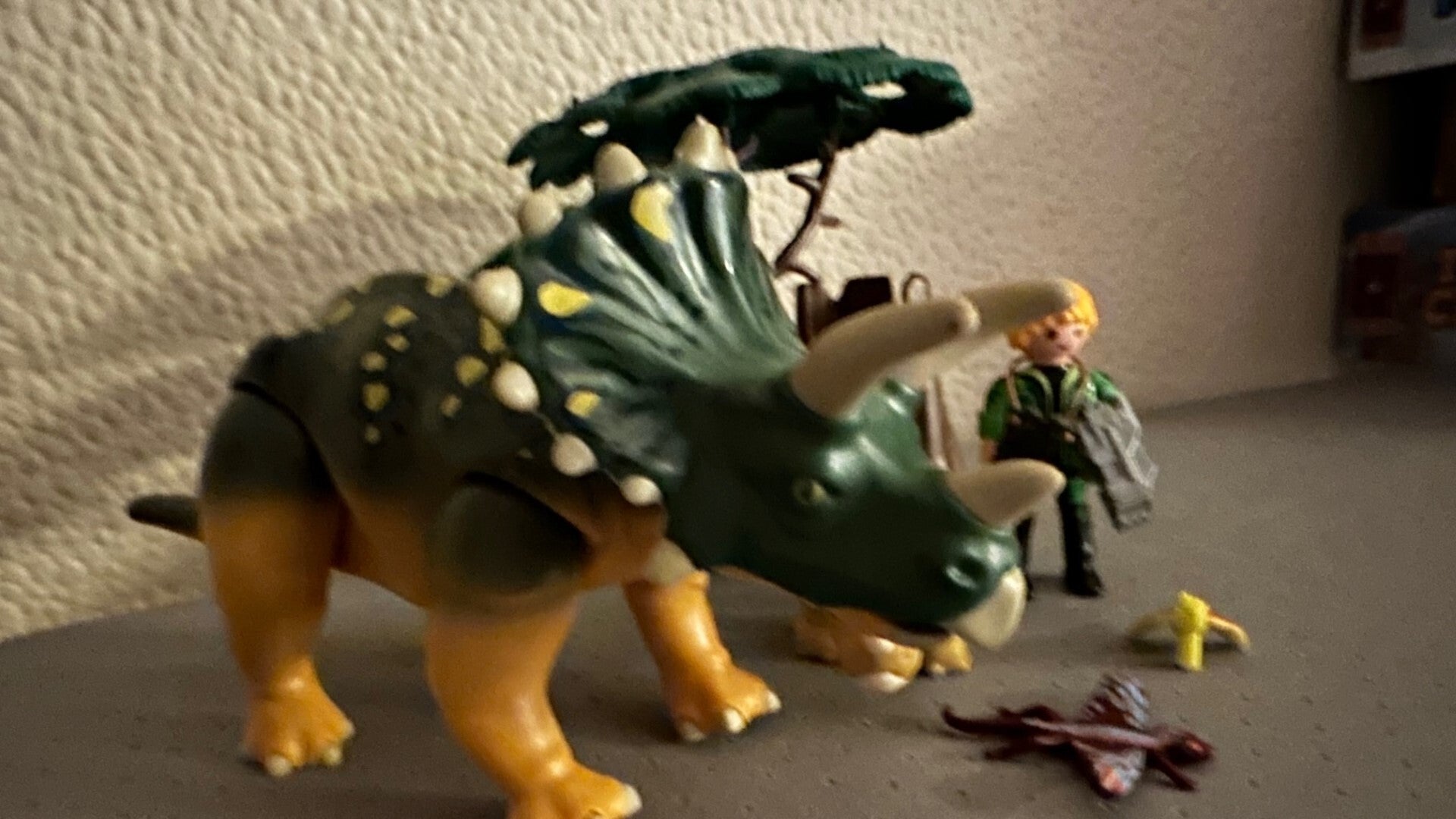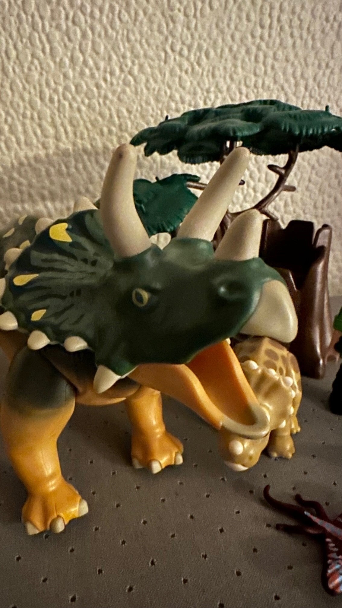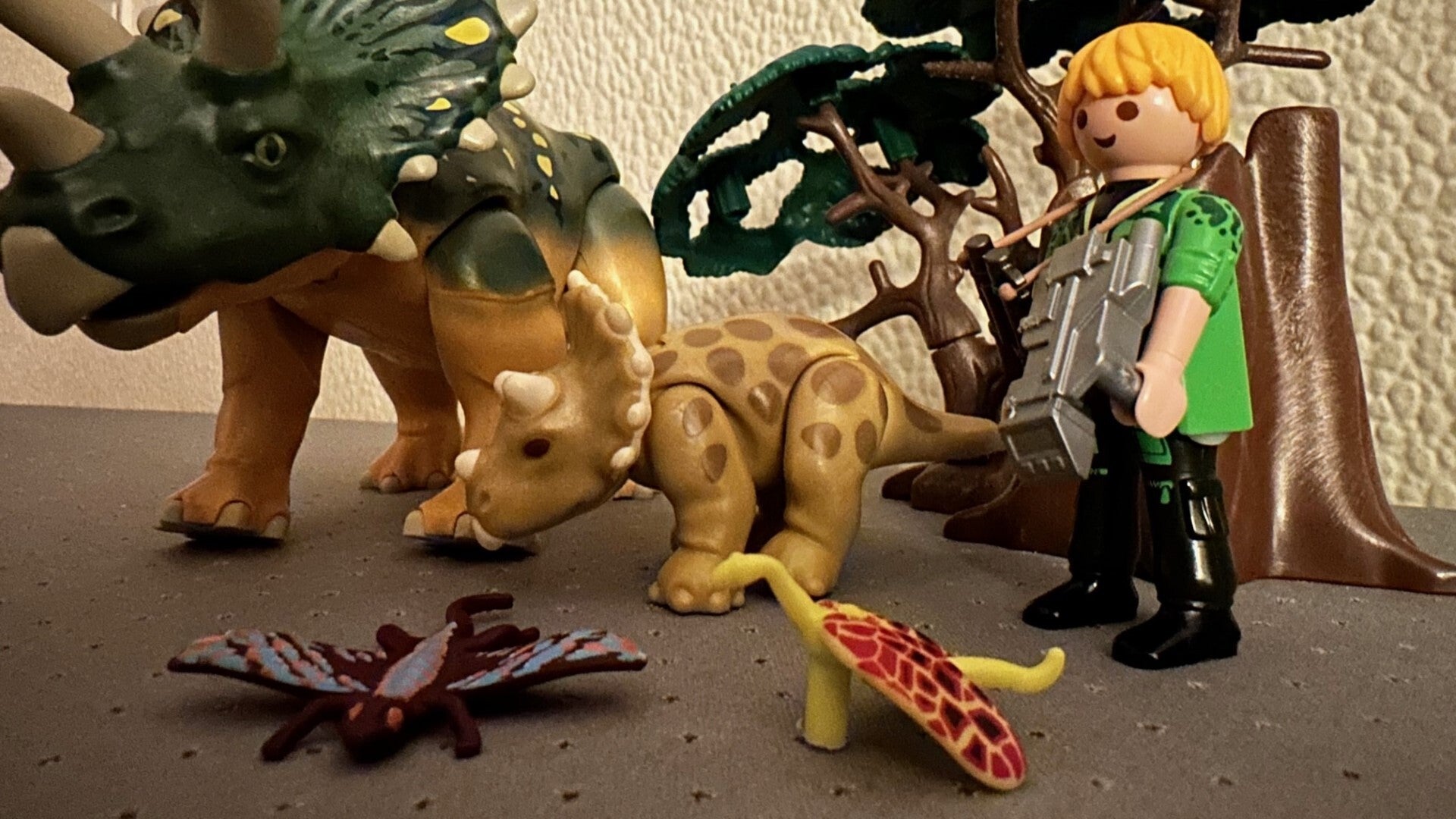 De Triceratops loopt nietsvermoedend in het wild met haar jong.
