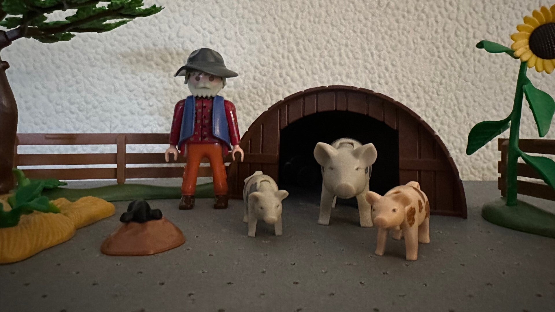 Hier kunnen ze lekker rondlopen in het zand en lekker luieren in de zon. Als het regent dan kunnen ze in het buitenhok gaan liggen. Inhoud: 5 hekken met gras om een omheining te maken, buitenhok, boom, 3 varkens, Bloemen en 1 Playmobil figuur.