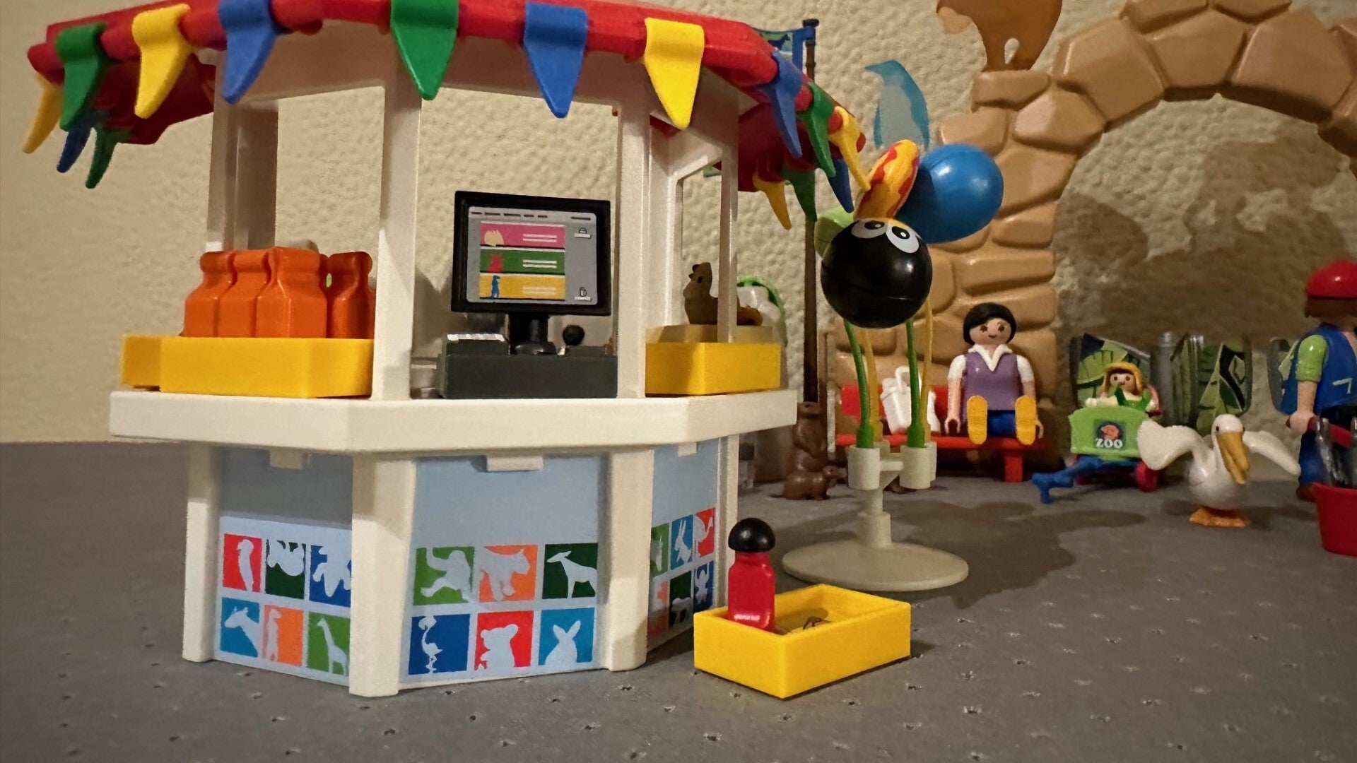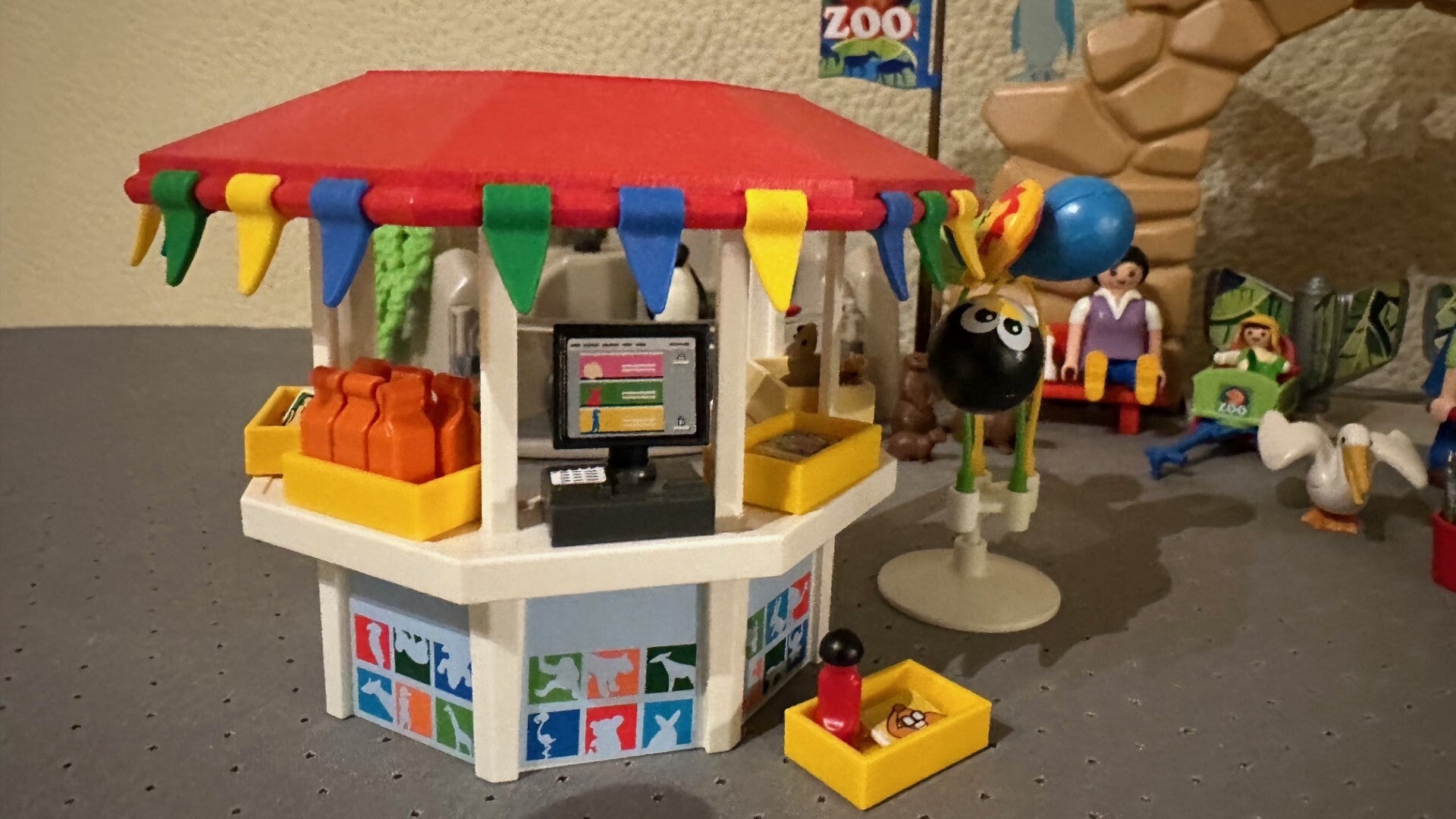 Via de stenen poort met dierenfiguren betreedt het gezin met hun bolderkar de dierentuin. Eerst gaan ze naar de kassa aan de kiosk. Hier zijn ook dierenvoer, snoep, luchtballonnen en souvenirs te koop. Om het bezoek aan het dierenpark optimaal te plannen kan het bord met de klok en de voedertijdstippen nauwkeurig bestudeerd worden. De marmotten hebben de bezoekers al ontdekt en komen nieuwsgierig tevoorschijn om ze te begroeten.