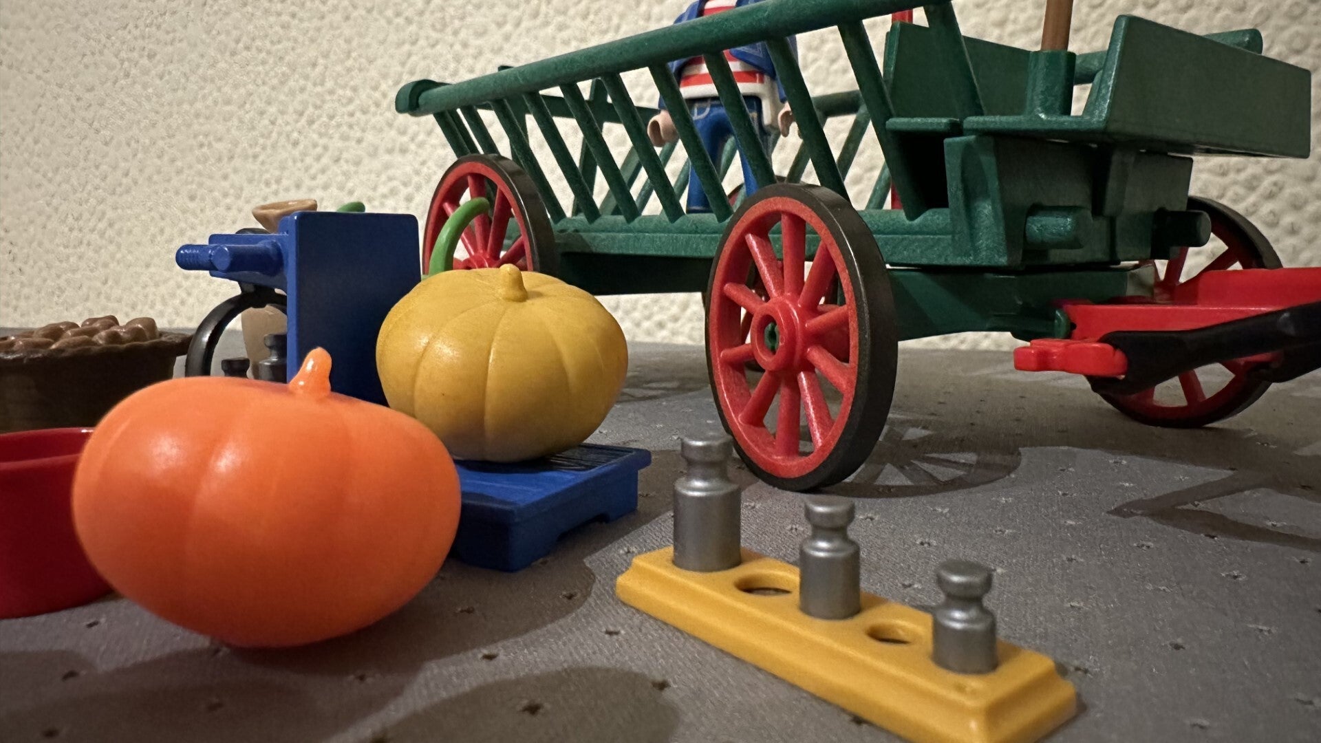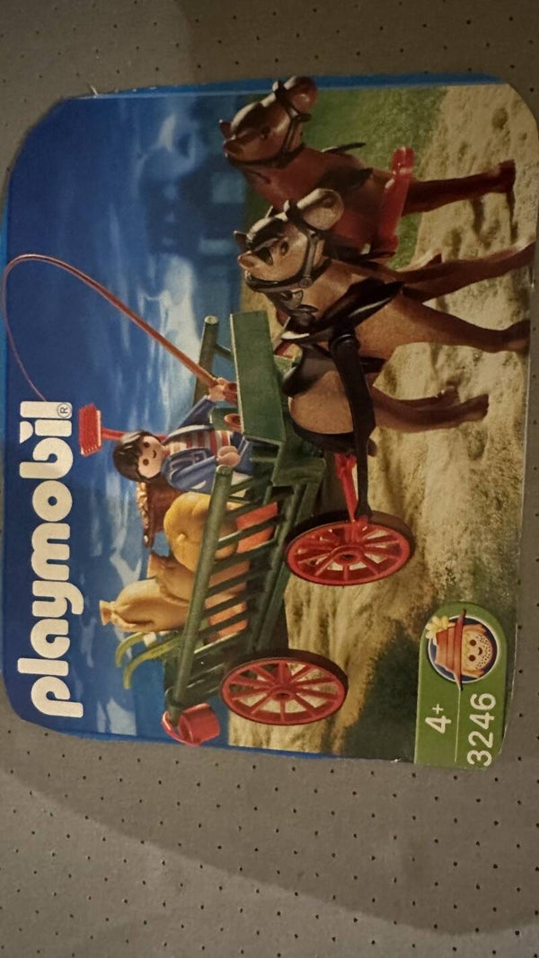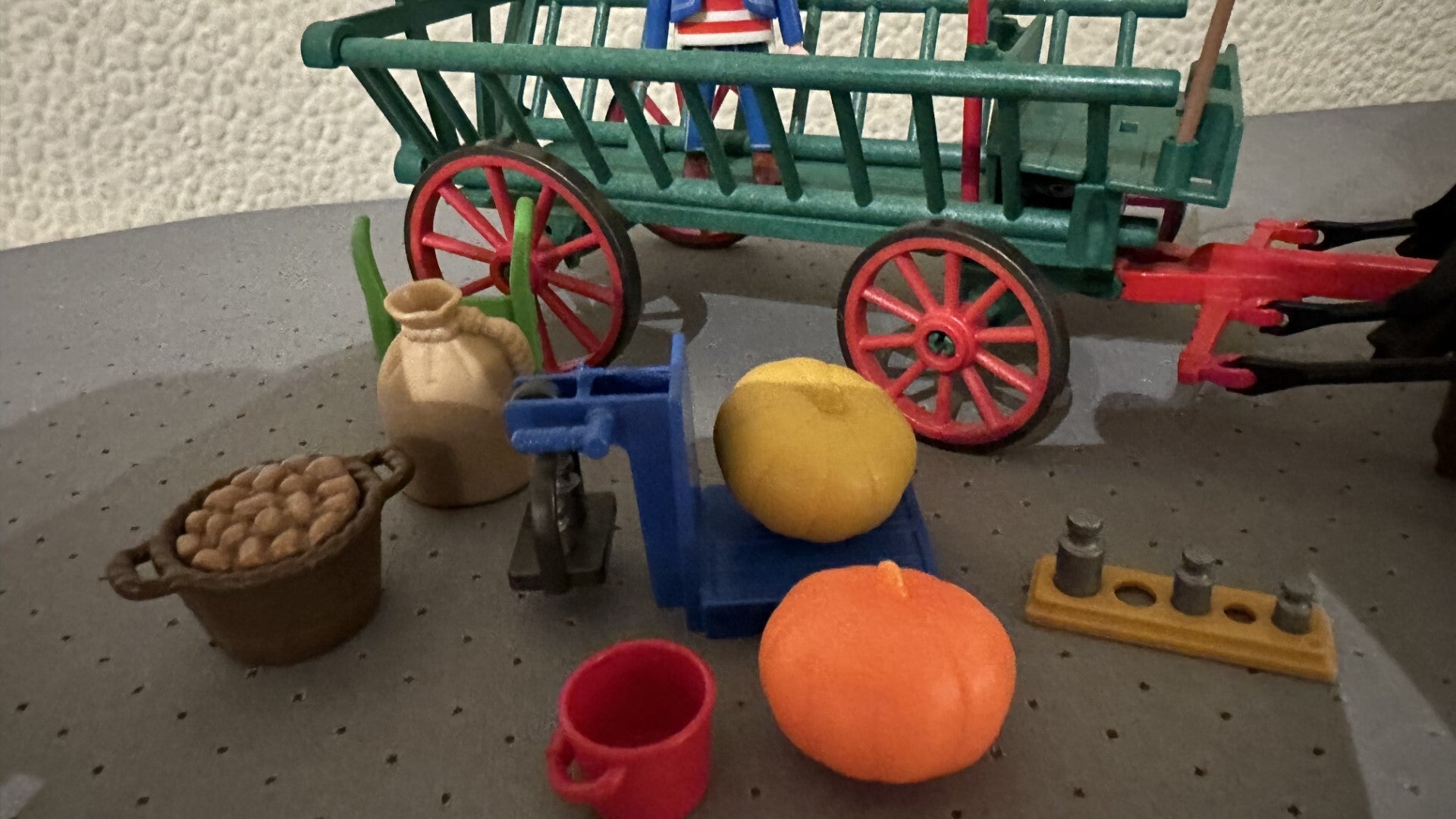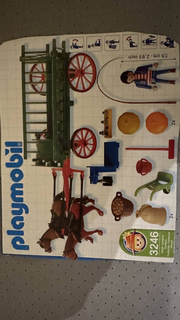 Deze boer brengt zijn groenten naar de markt met zijn kar. Naast aardappels, een zak met graan en pompoenen heeft hij ook een steekwagentje en een weegschaal met gewichten bij zich. Inclusief bezem, zweep, emmer, 2 paarden en 1 Playmobil speelfiguur.1