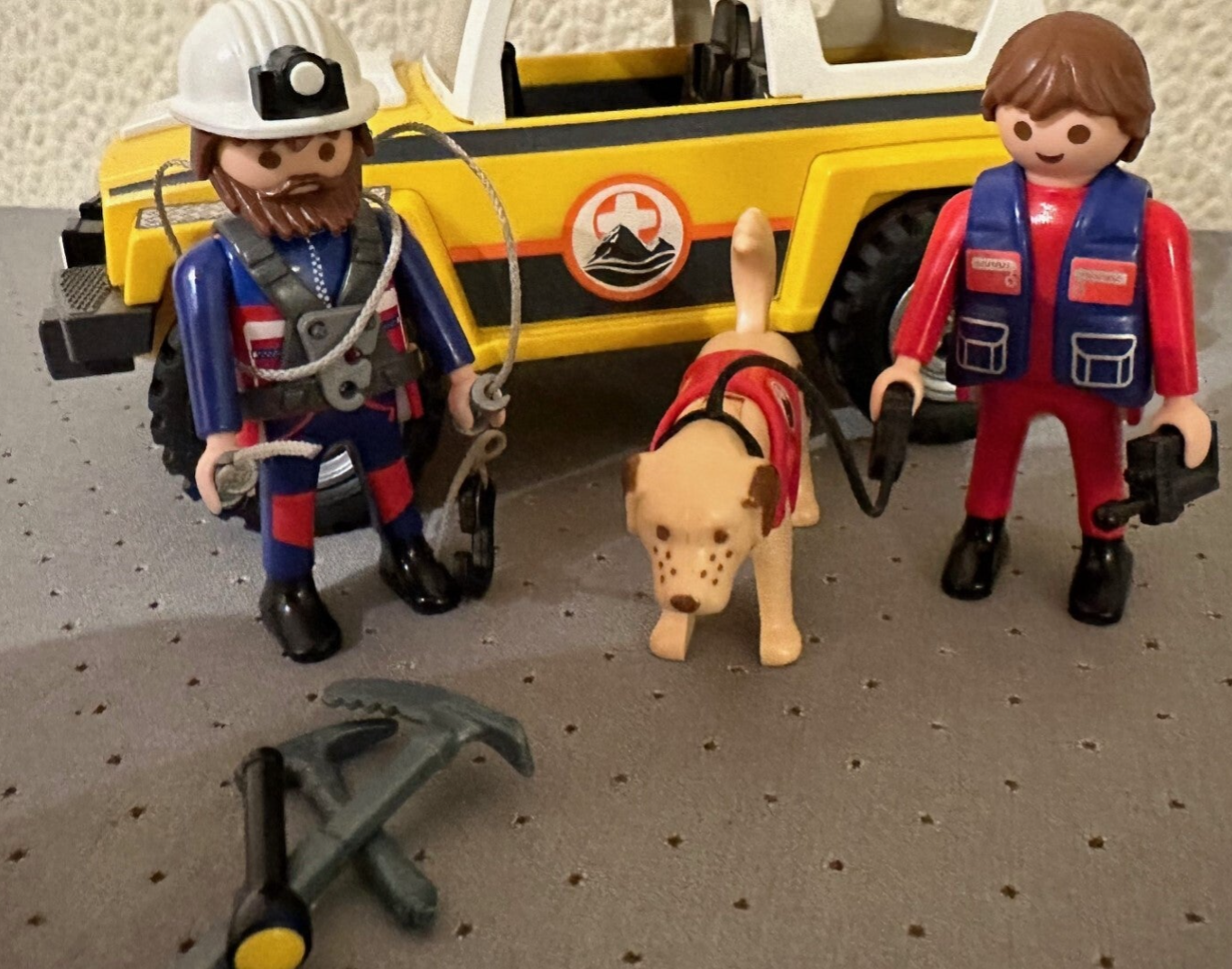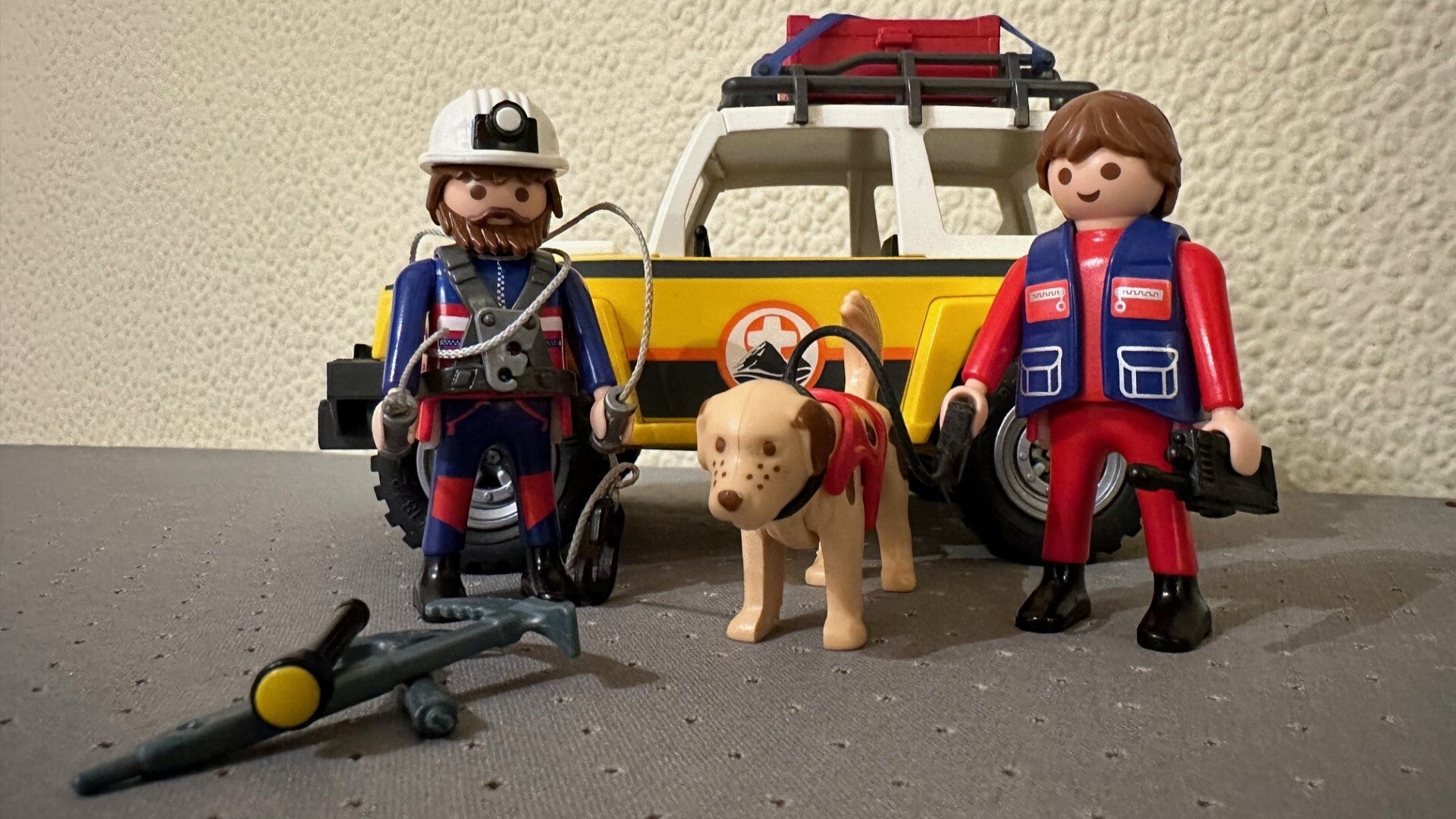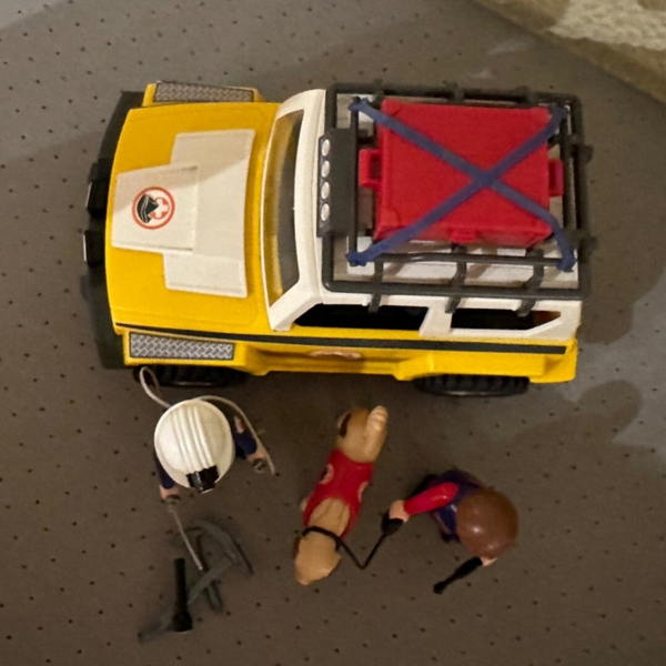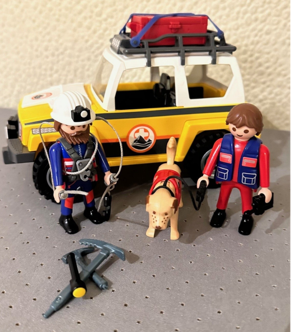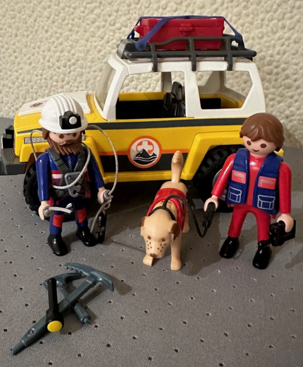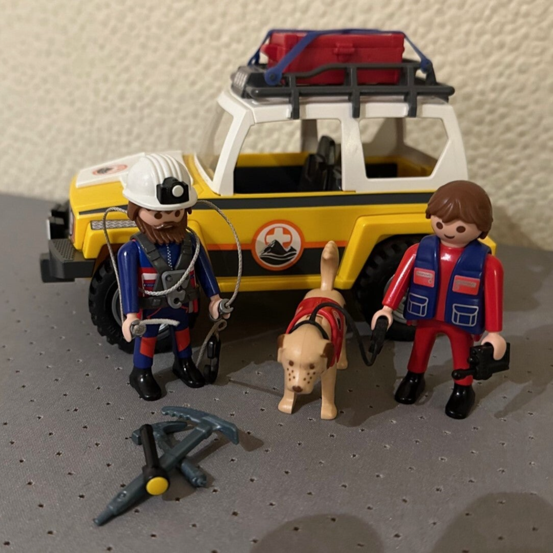Playmobil terreinwagen met afneembare dakbox en reddingshond. Afmetingen: 18,5 x 10,5 x 10 cm (L x B x H).