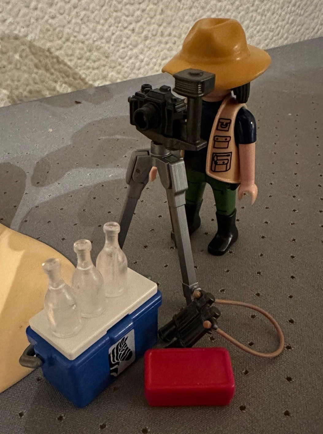 bevat 1 figuur, 1 baby-olifant, een neushoorn en zijn kleintje en een panter. Ook 1 playmobilfiguur et een verrekijker en een camera.