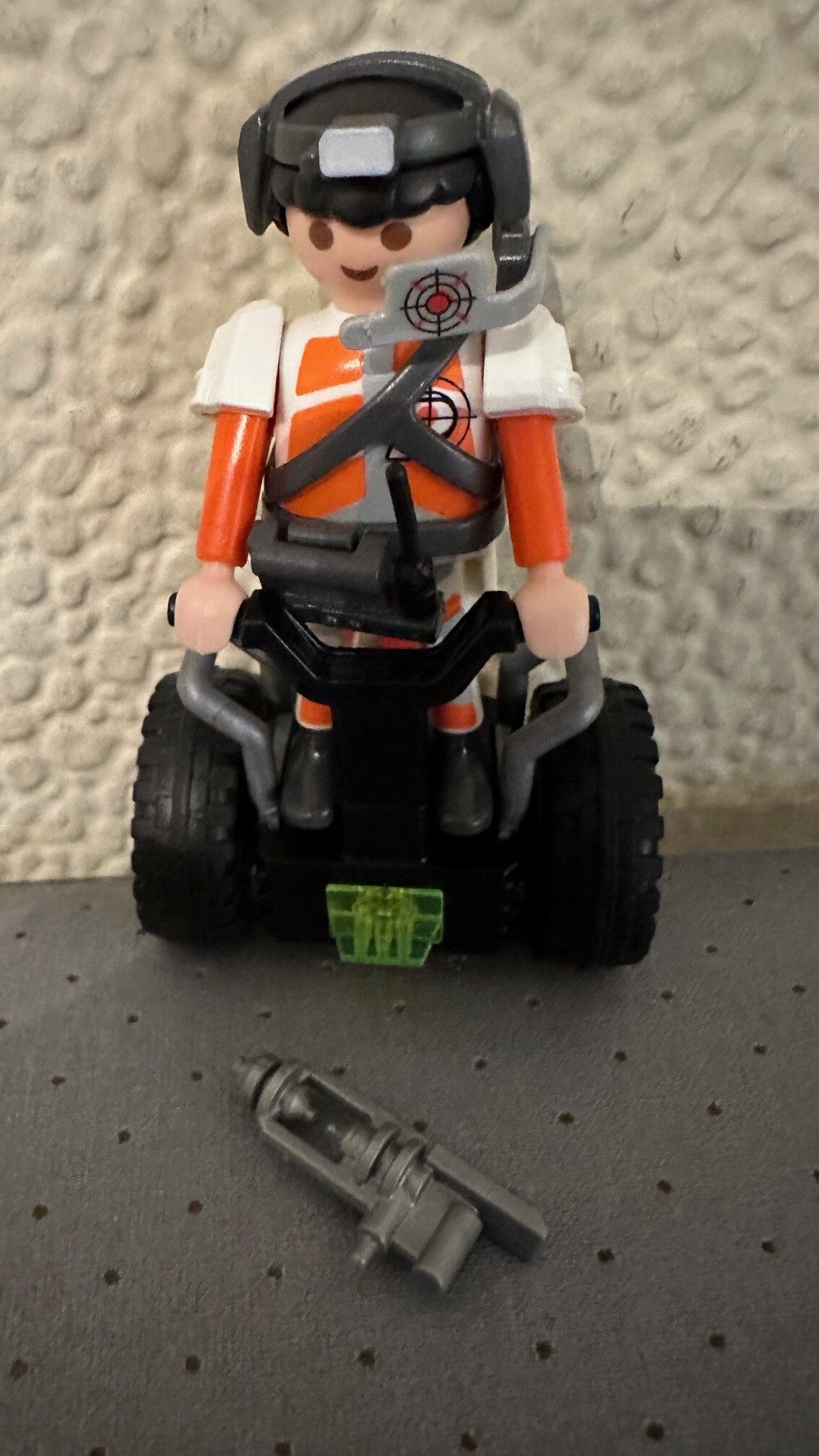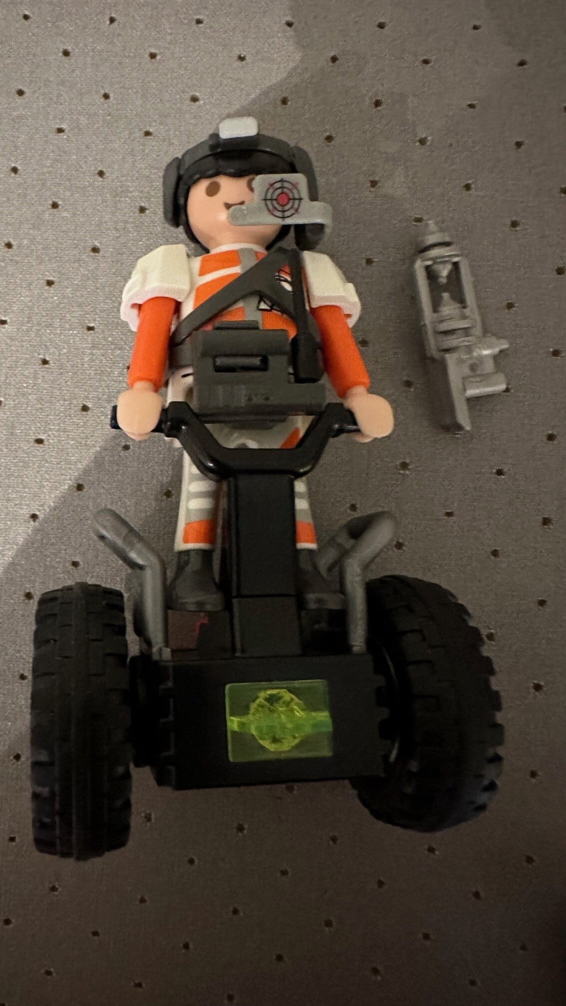 De agent springt op zijn balans racer en achtervolgt de Mega Master.
