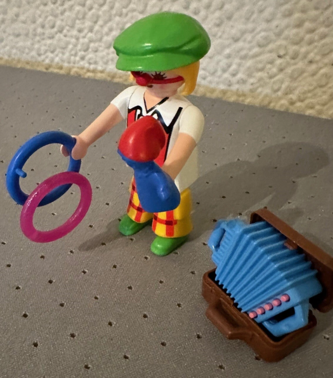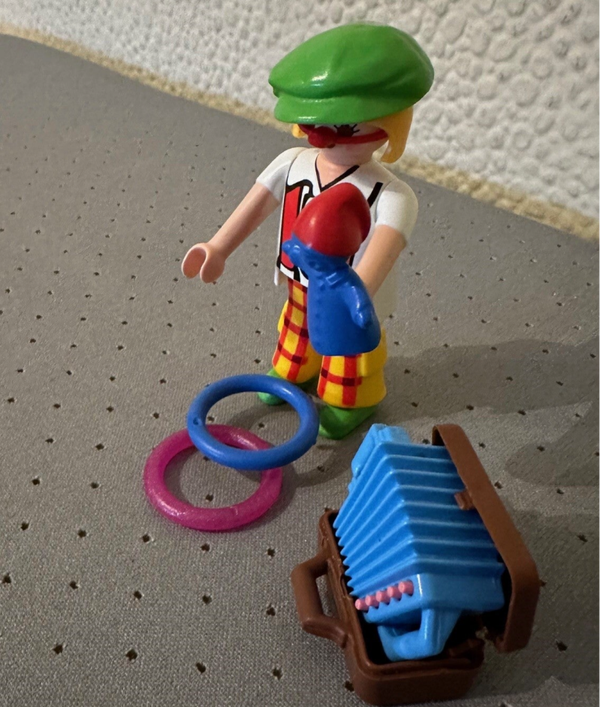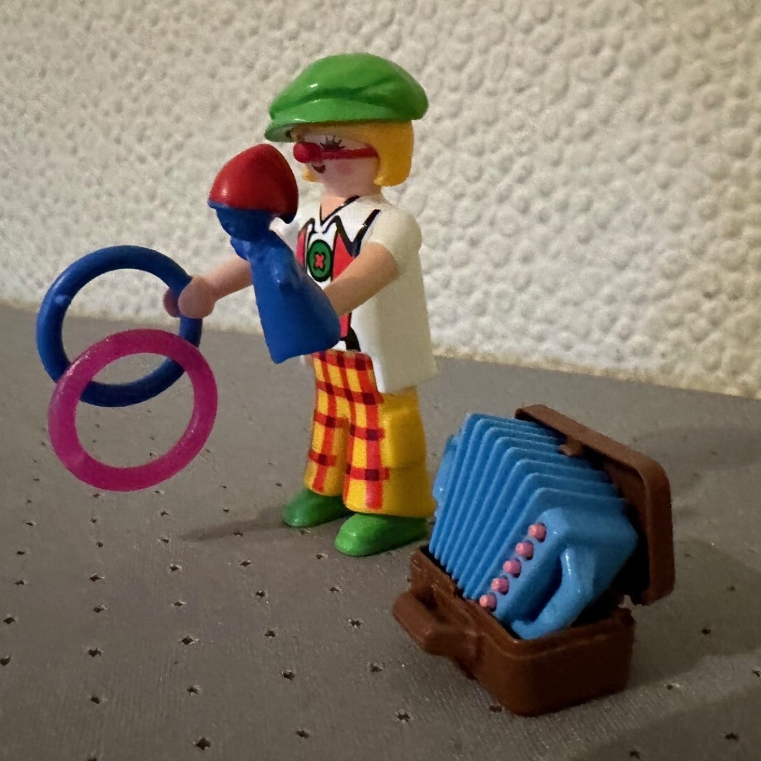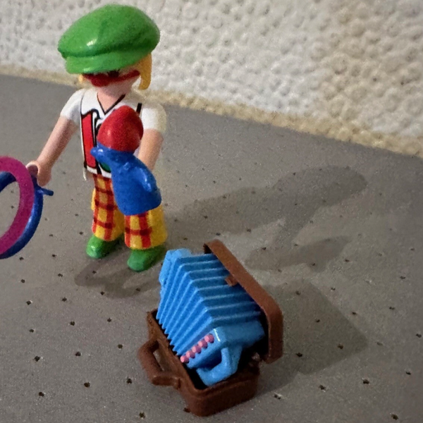 Dit is een cliniclown met accordeon, ringen, pop en koffertje.