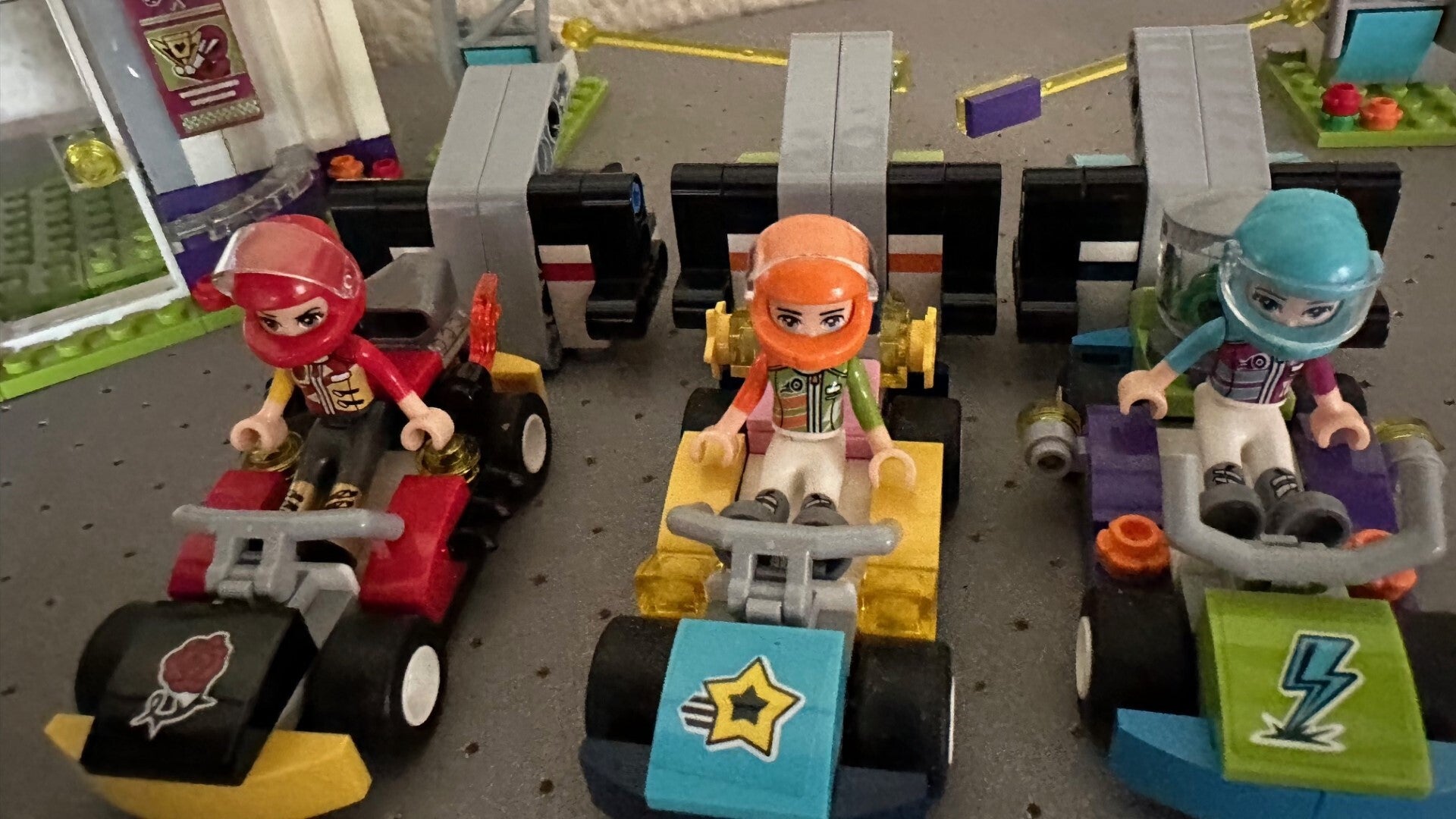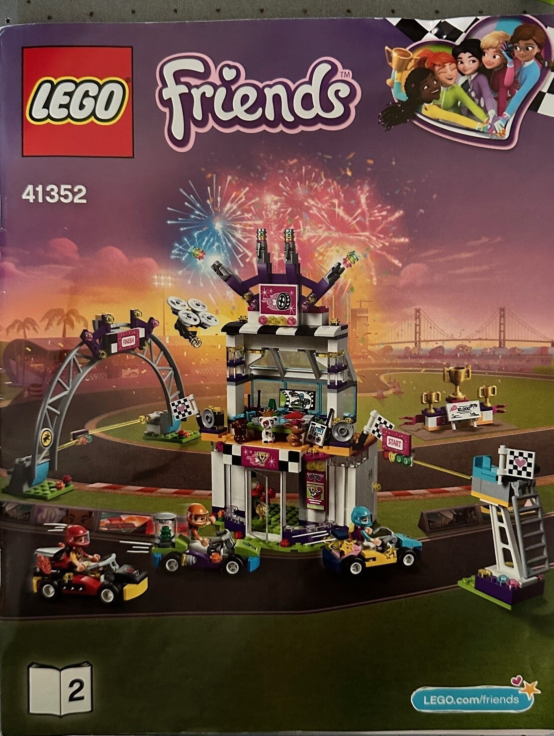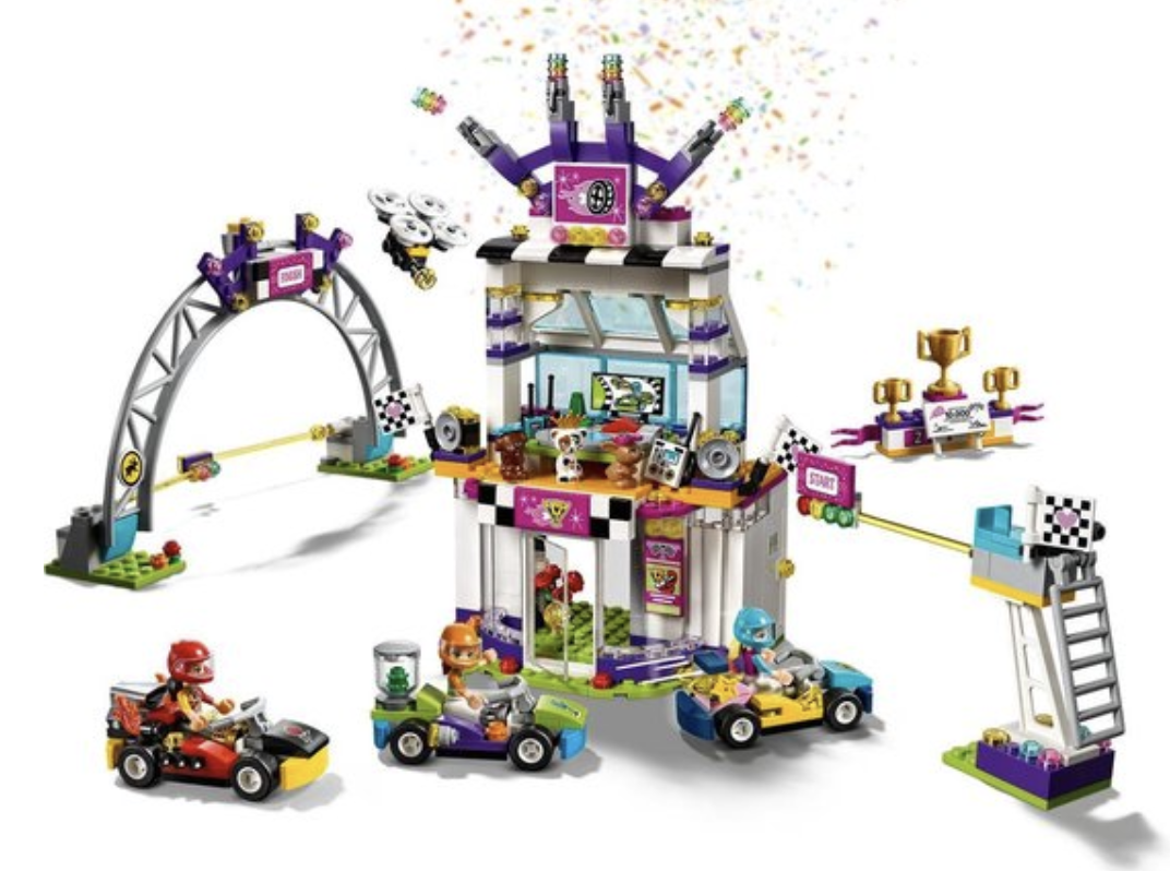 Het is LEGO Friends 41352 De grote racedag: de vriendinnen uit Heartlake City strijden tegen elkaar in een spannende kartrace.