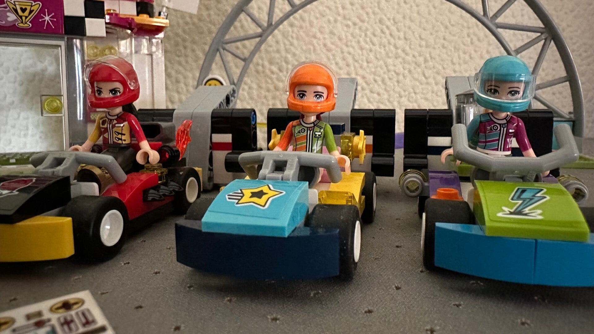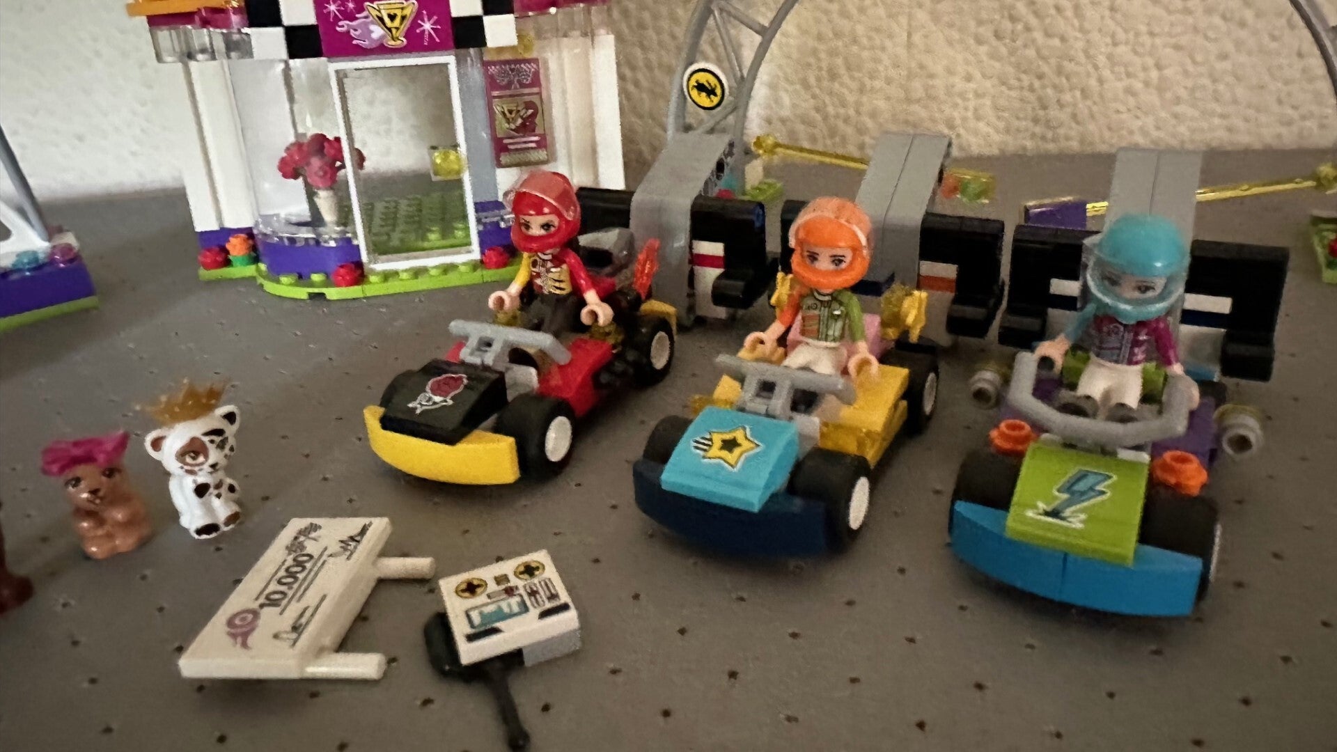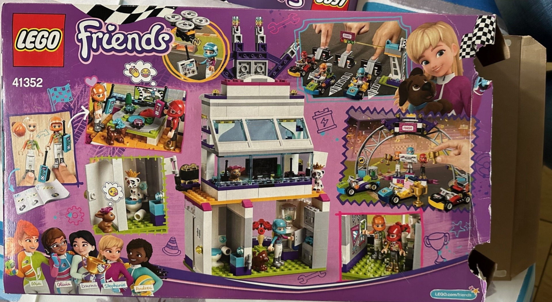 Het is LEGO Friends 41352 De grote racedag: de vriendinnen uit Heartlake City strijden tegen elkaar in een spannende kartrace.