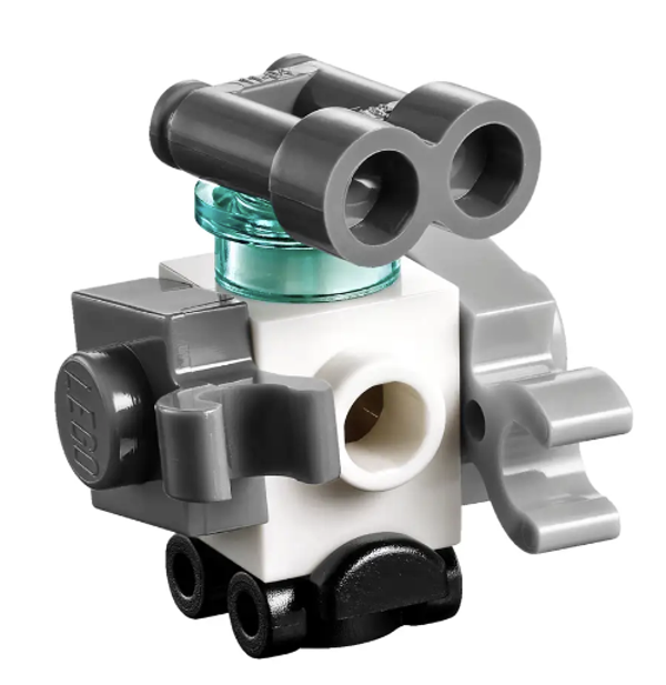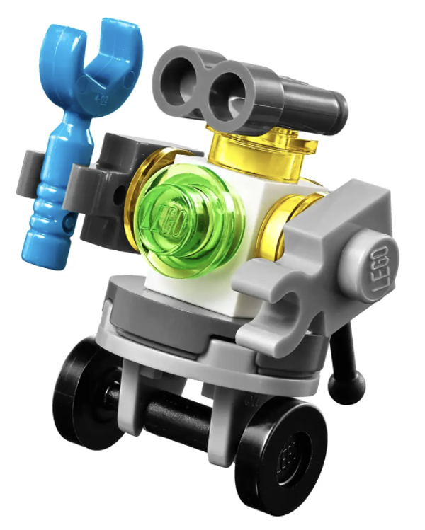 - De set bestaat uit een laboratoriumtafel met tekenbord en lade die open kan, een opbergdoos plus een oplaadstation met scherm en ruimte voor drie robots.