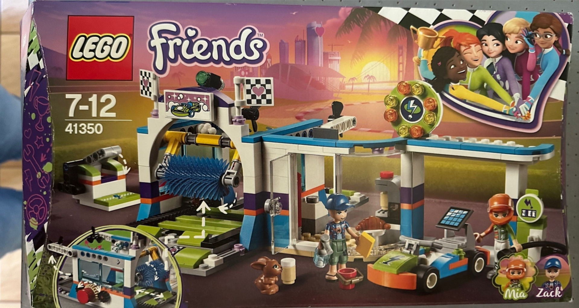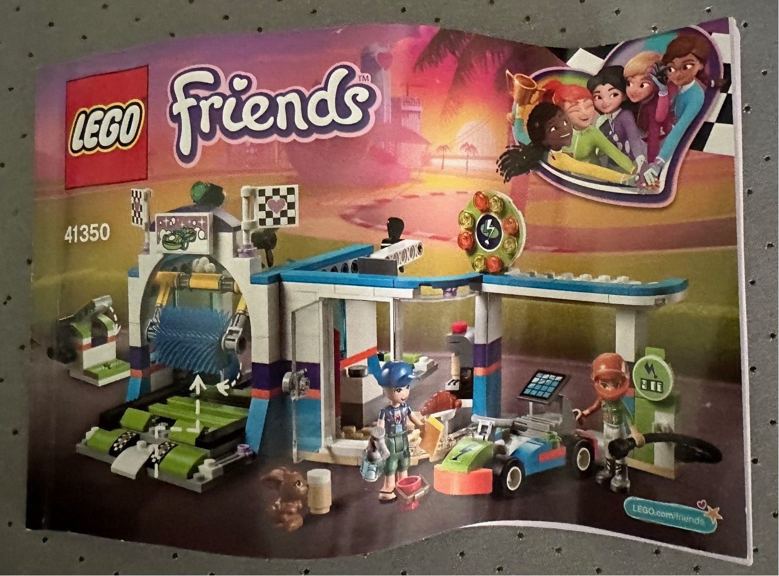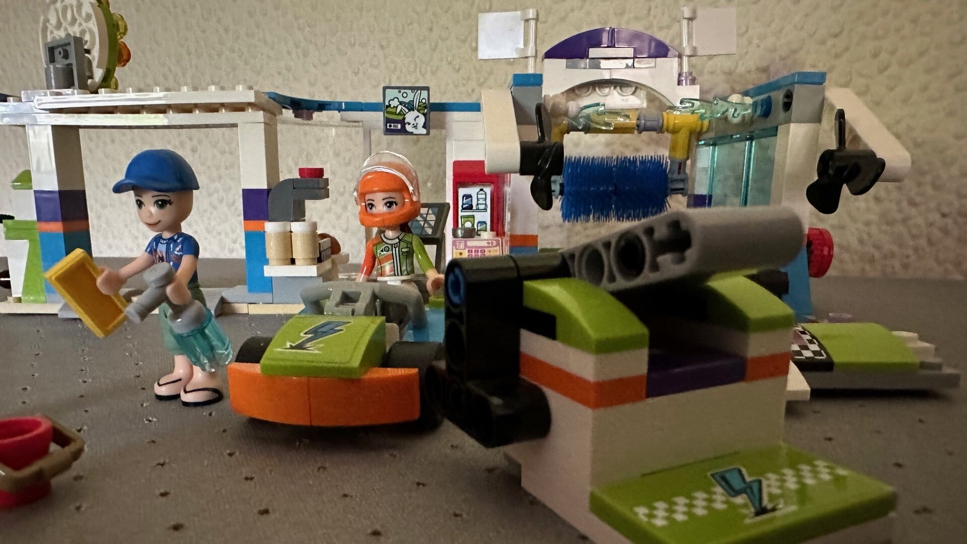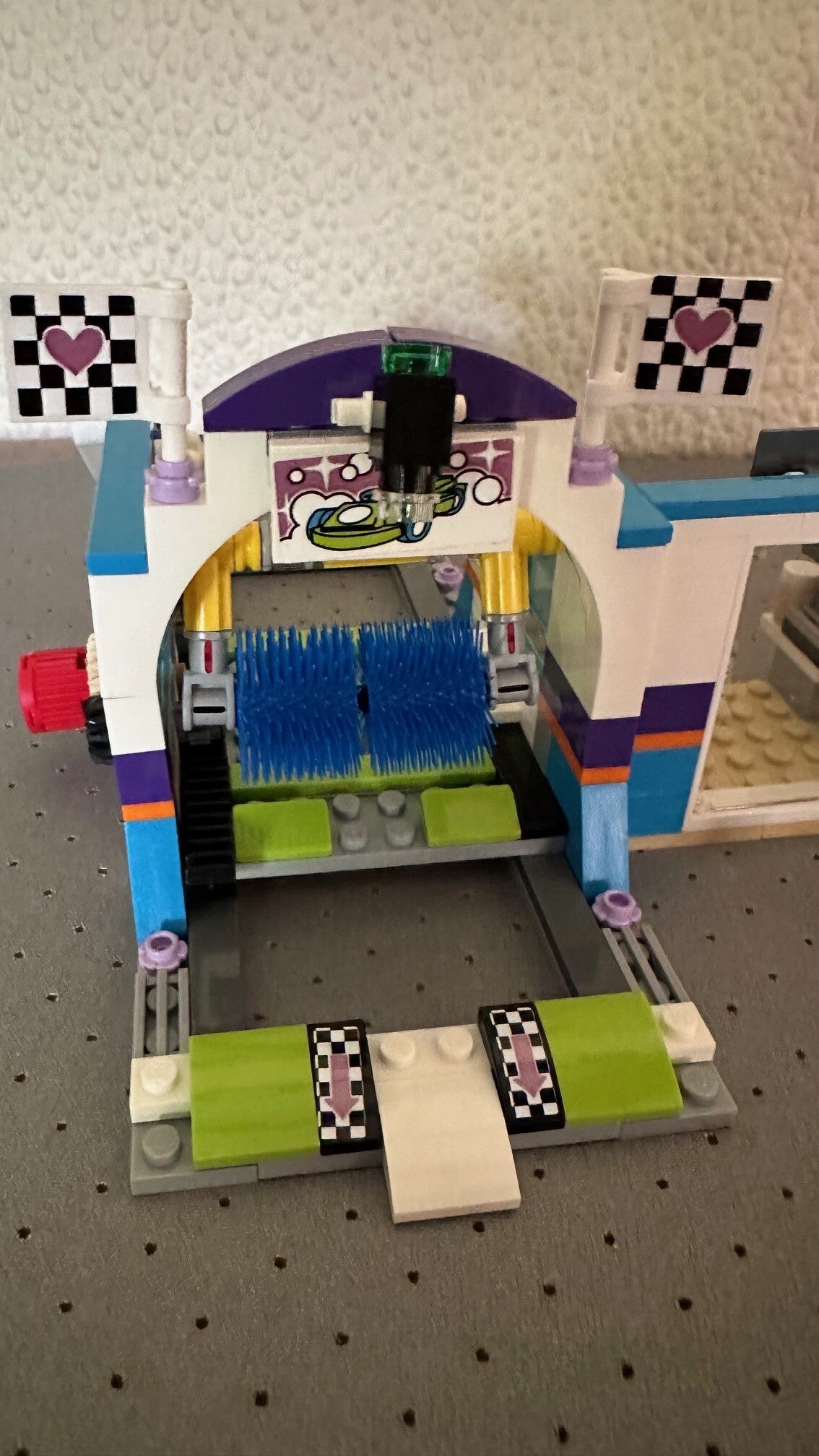 Deze LEGO Friends set bevat een functie om de borstel in de wasstraat te laten bewegen en draaien, een tankstation met een klein winkeltje, 2 minipoppetjes en een konijnenfiguur.
