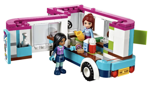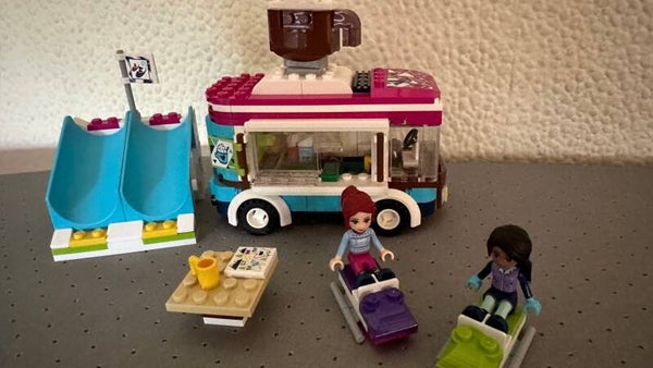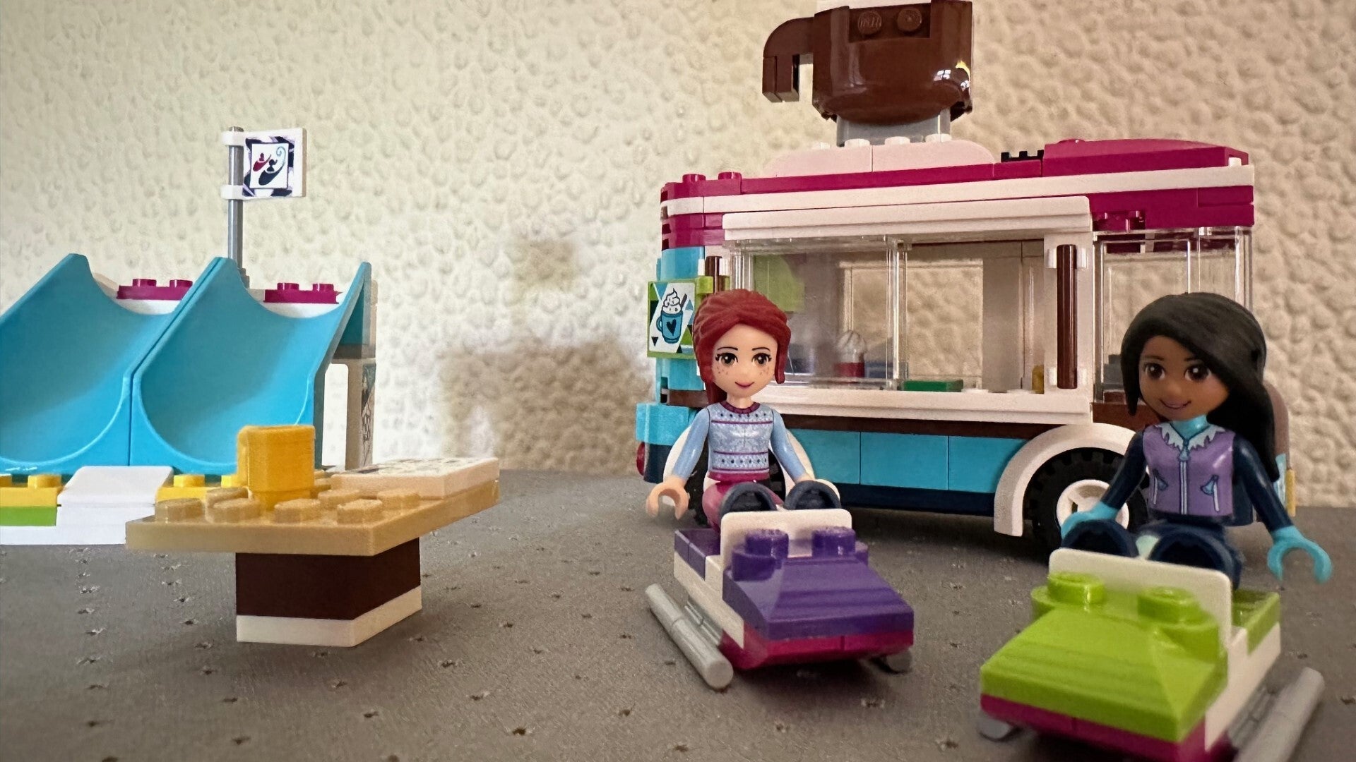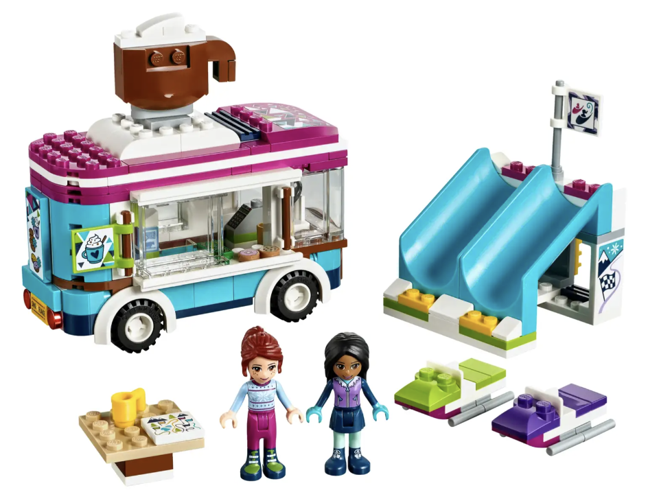 - De set omvat een bestelwagen met een schuifraam om warme chocolademelk te serveren, een kassa, een machine om warme chocolademelk te maken plus een tafel en een sleehelling met twee sleeën.