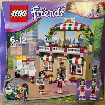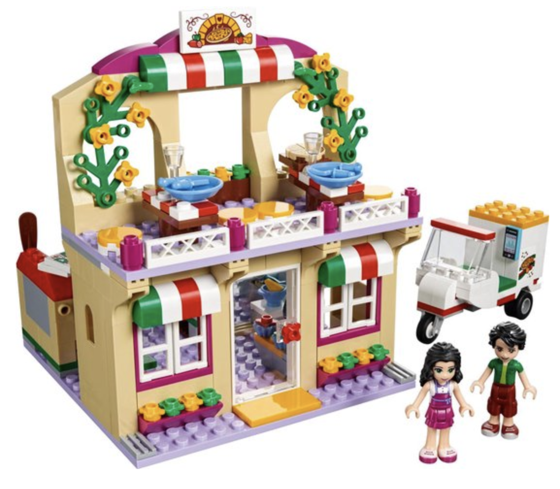 De LEGO® Friends Heartlake pizzeria heeft alles wat je nodig hebt om te spelen dat je zelf heerlijke pizza's klaarmaakt en bakt. Serveer ze op het restaurant-balkon of neem telefonische bestellingen op en laat de pizza's thuisbezorgen door Oliver op zijn scooter. Er is zelfs een kraampje waar tevreden klanten basilicum- en tomatenplantjes kunnen kopen! Inclusief twee minipoppetjes.