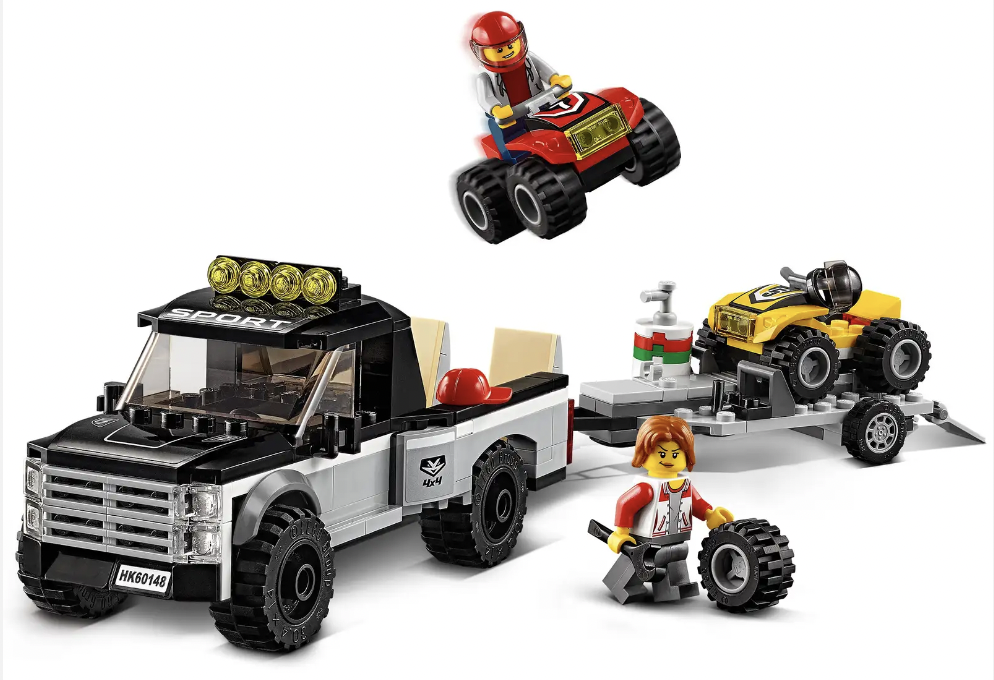 Rijd spannende wedstrijden met het LEGO® City ATV raceteam. Bij de set horen twee quads, een pick-uptruck met trekhaak en laadbak met verstelbare hellingbaan, een afkoppelbare aanhanger met verstelbare hellingbaan, plus helmen, een brandstofton en een reserveband.
