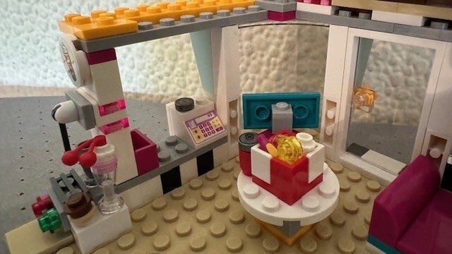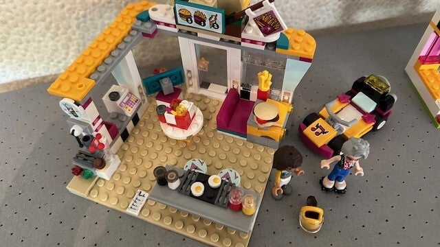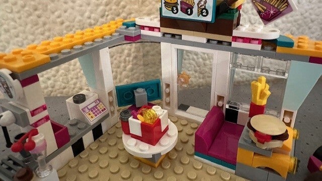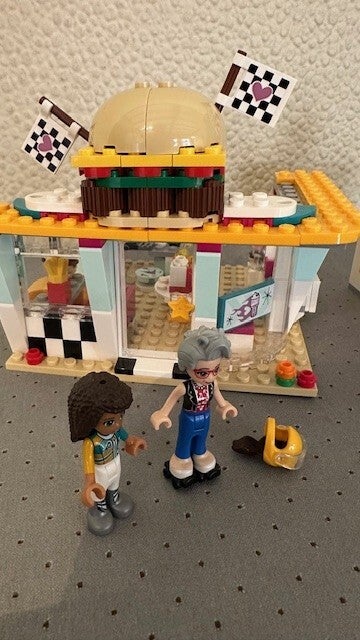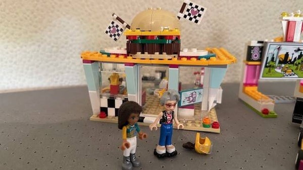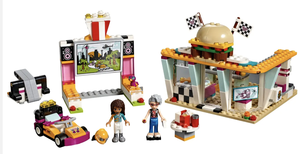 - De set omvat een diner in retrostijl met een grill, een afhaalloket, een kassa, een stijlvolle autovormige tafel met bankje en een enorme hamburger op het dak, een drive-inbioscoop met een groot scherm, Andrea's kart en een kartlanceerder.