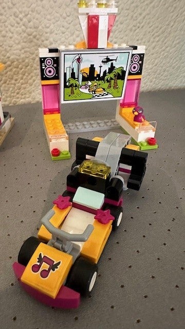 De LEGO® Friends 41349 Go-kart diner is voorzien van een grill voor hamburgers, een afhaalloket met kassa, een stijlvolle autovormige tafel met bankje en een enorme hamburger op het dak. Buiten staat een heel groot scherm voor drive-infilms, inclusief handige bijzettafeltjes. Je zelfs kunt je eigen mobiele telefoon of tablet voor het scherm zetten om echte video's af te spelen voor de minipoppetjes. Deze retro LEGO Friends set is inclusief Andrea's kart en een kartlanceerder, plus 2 twee minipoppetjes en een vogelfiguur.